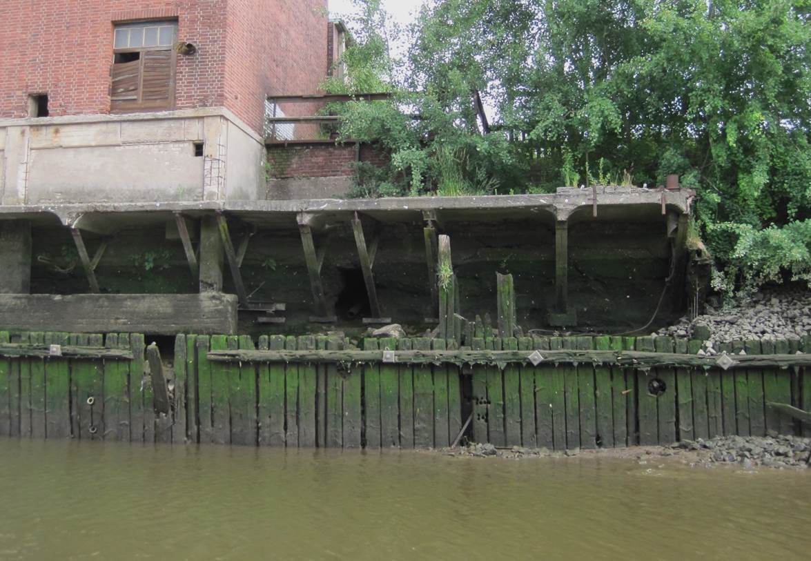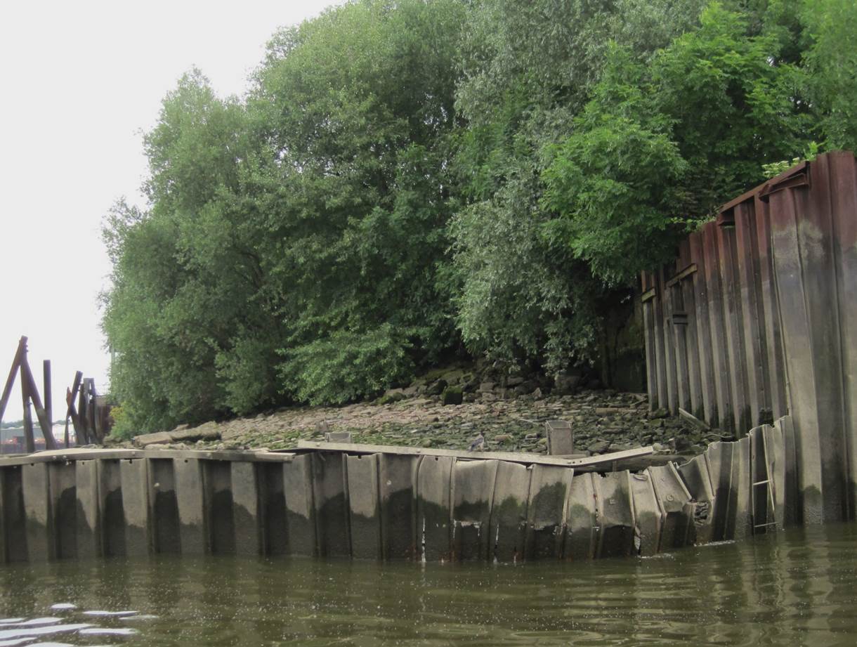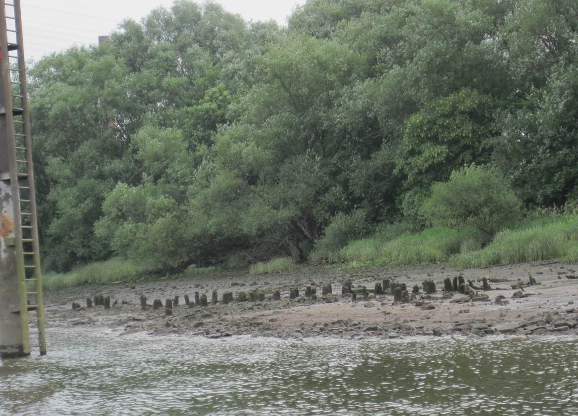 Ein altes Wikingergrab, eine Schiffssetzung vor Auwald? Wohl eher – neben modernem Stahlpfahl – kompostierte Pfahlreihen einer alten Hafenanlage.