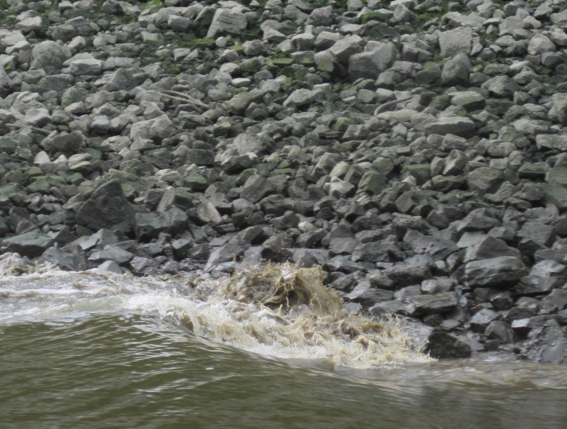 Die Barkasse wirbelt ordentlich Wasser beim Drehen. Zur Sauerstoffanreicherung reicht das gleichwohl nicht.