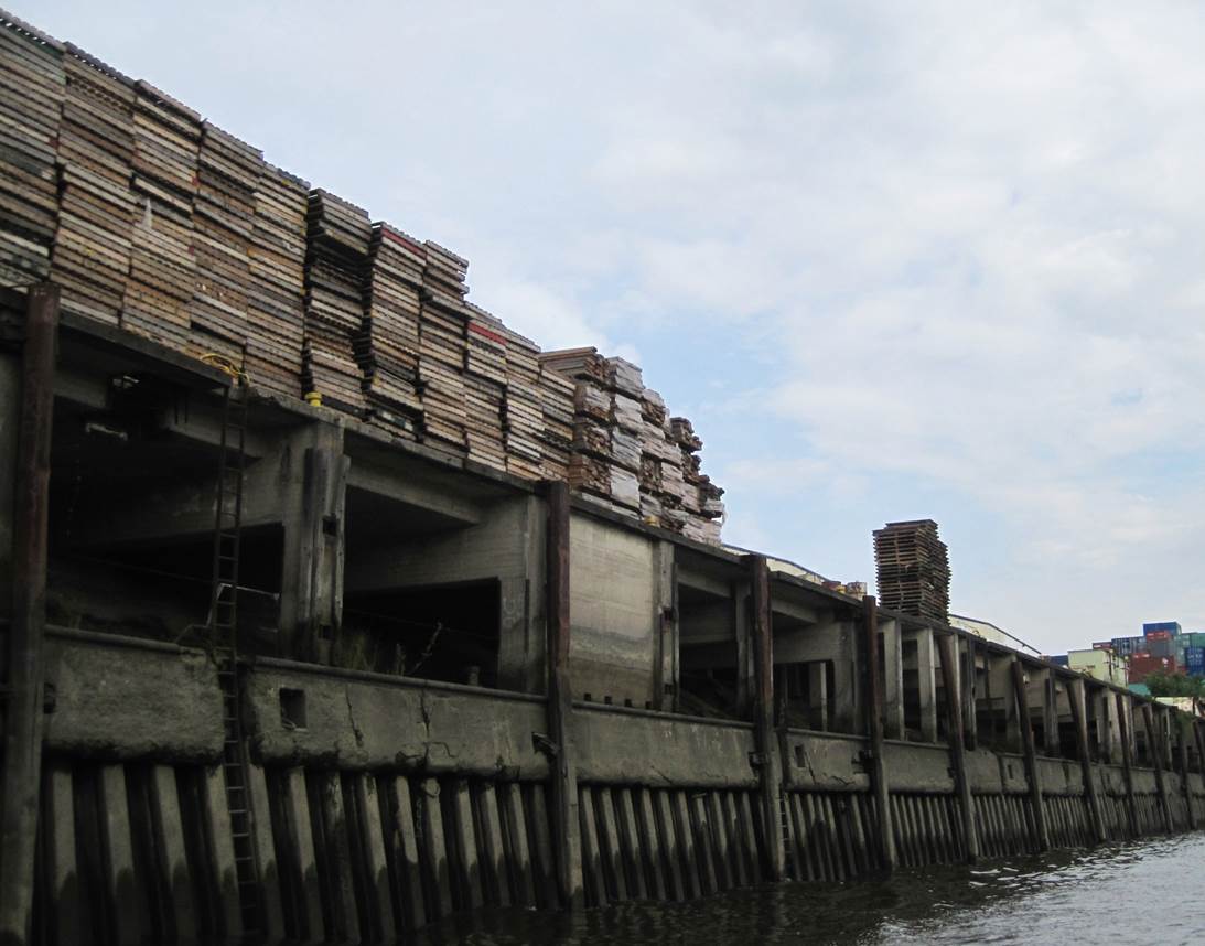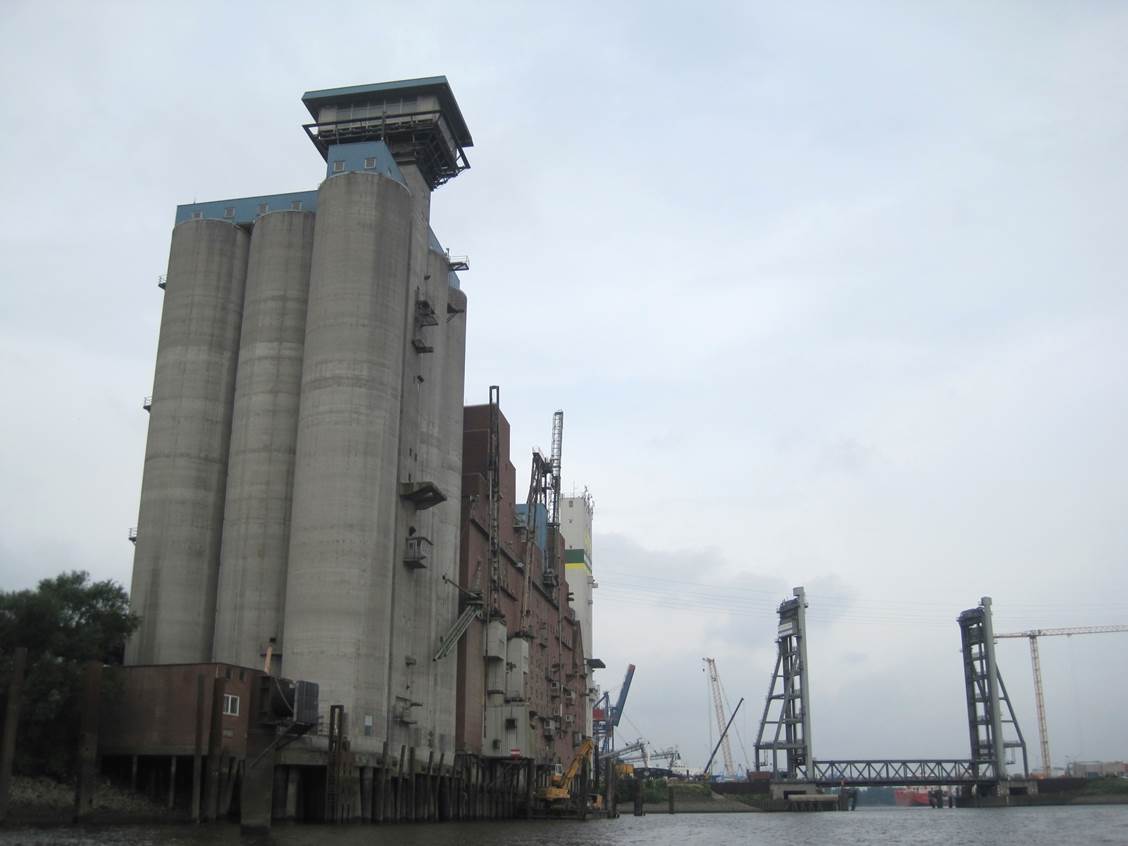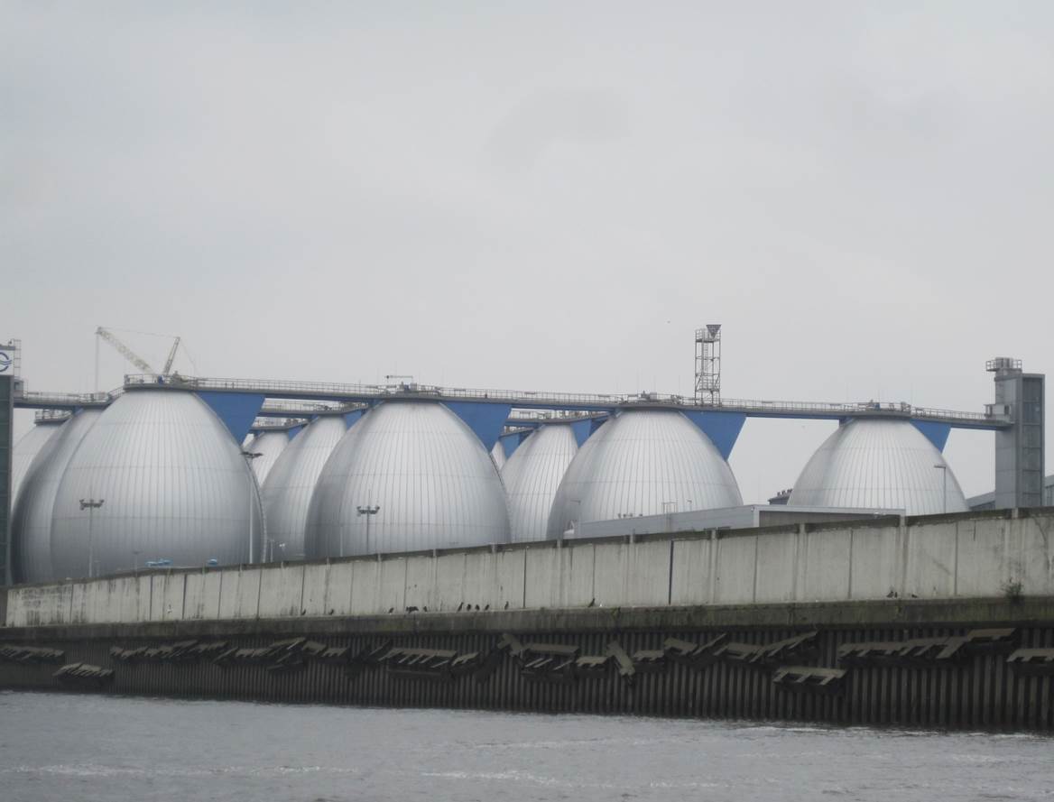 Vorbei geht`s an den Faultürmen für Klärschlamm auf dem Klärwerksgelände Köhlbrandhöft. Im Vordergrund trocknen – unscharf – Kormorane.