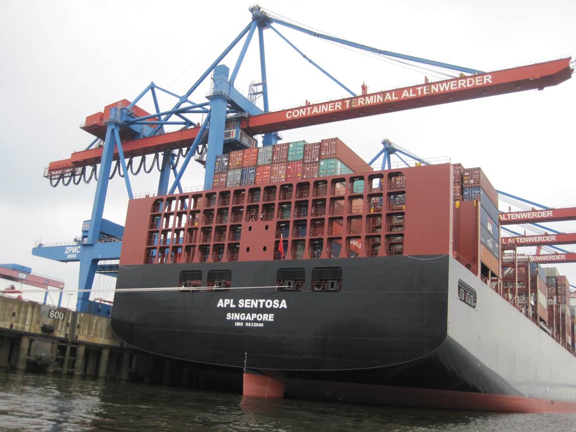 Oha, das sind mal Größenverhältnisse. Wir sind an einem Container-Terminal im Köhlbrand, wie die Süderelbe hier heisst, angekommen – „Altenwerder“ erinnert an das historische Bauern- und Fischerdorf, das hier weichen musste.