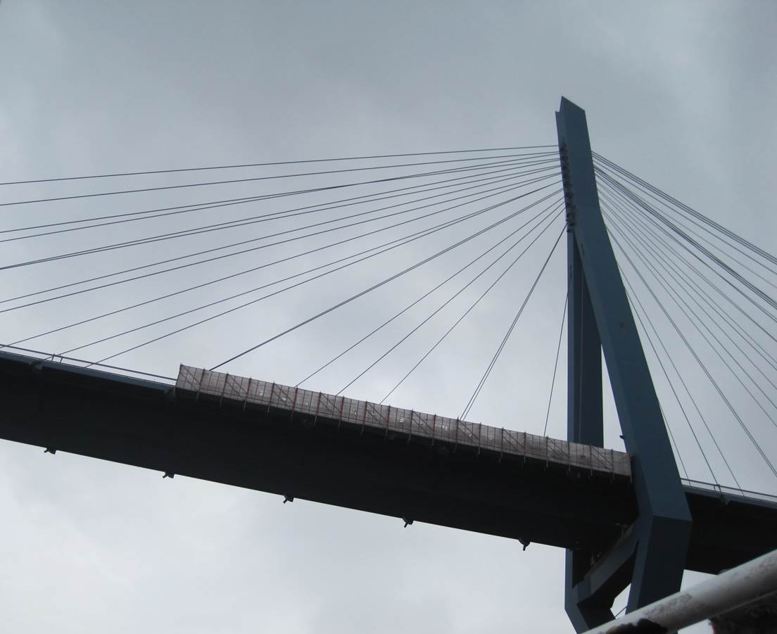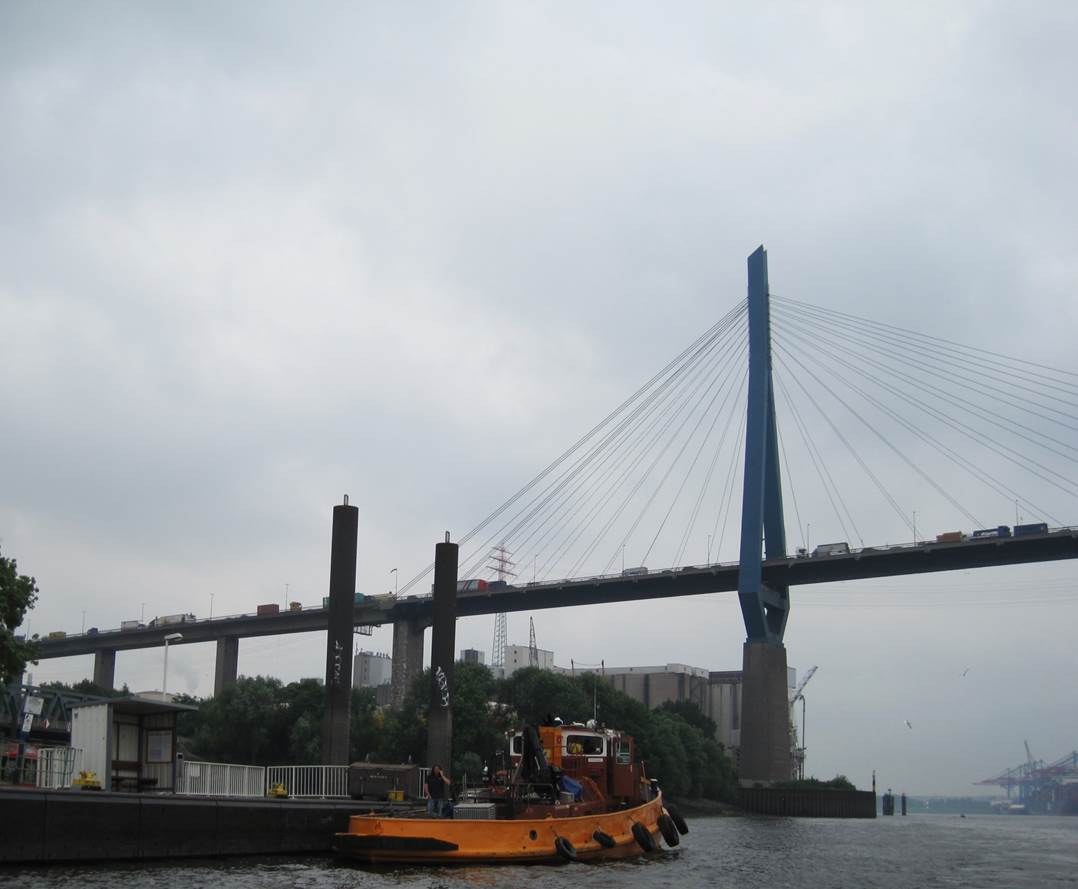 Wir passieren das Jahrhundertbauwerk Köhlbrandbrücke – nach 40 Jahren Standzeit in Abriss- und Ersatzdiskussion.