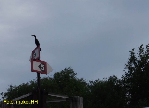 Nun gucken wir, noch ziemlich Tideniedrigwasser, ins Nikolaifleet hinein, fast identisch mit dem früheren Alstermündungsmäander. Hier sollen mal die Wanderfische durch, wenn die Alsterfischpässe fertig sind.