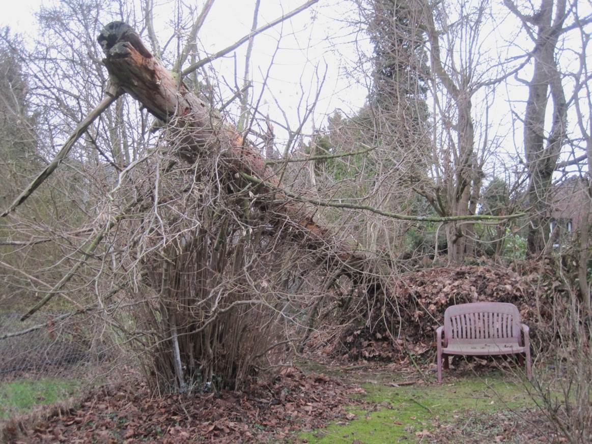 Nun liegt der Stamm auf einem Totholzhaufen und – vorn im Bild – einem unserer Haselnussbüsche, von denen in den “Hölzchen und Stöckchen”-Beiträgen oft die Rede ist.