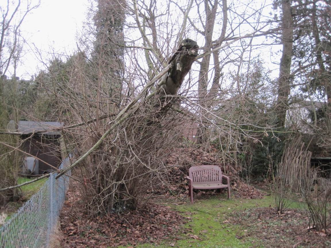So etwas nennt man sauberen Fall – unser Zaun zum Nachbarn ist frei, 3 Äste, die im Bild noch sichtbar sind, abgesägt.