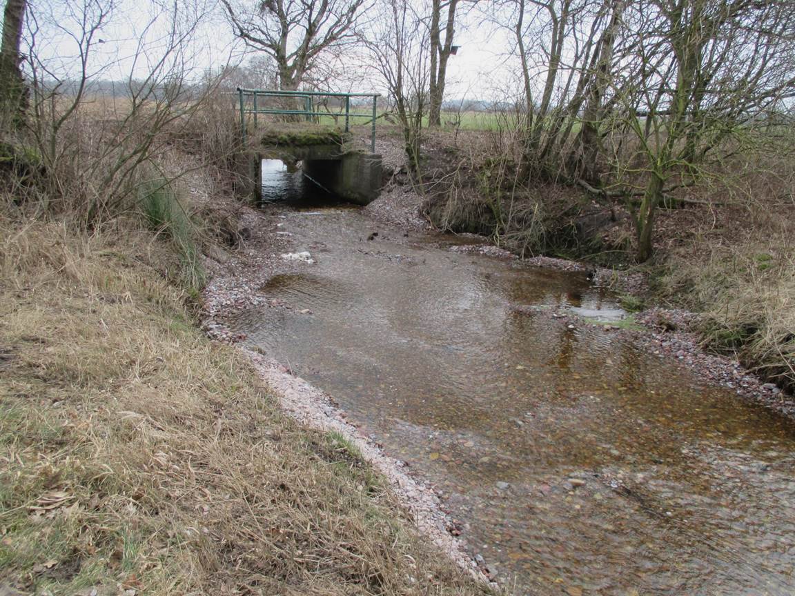 So „verschwindet“ der Bach zwischen den Erlen an der Überfahrt. Wie hier zeigen nur an wenigen Stellen unserer Bäche noch beidseitig stehende Altbäume den naturnahen Zustand, unter anderem mit seinem viel schmaleren und lebendigeren Profil als die fortwährend kaputt gebaggerten Agrar-Einöden.