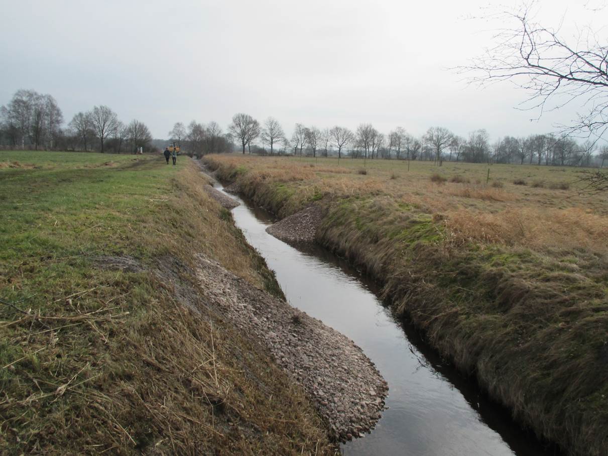 Das interne Unterstützen der Mäandertendenz ist gut gelungen. Rinnenbildung und vor sowie hinter den Einbringorten entstandene Ruheräume geben dem Bach nun verschiedene Teillebensräume anstelle der vorherigen Sandwüste.