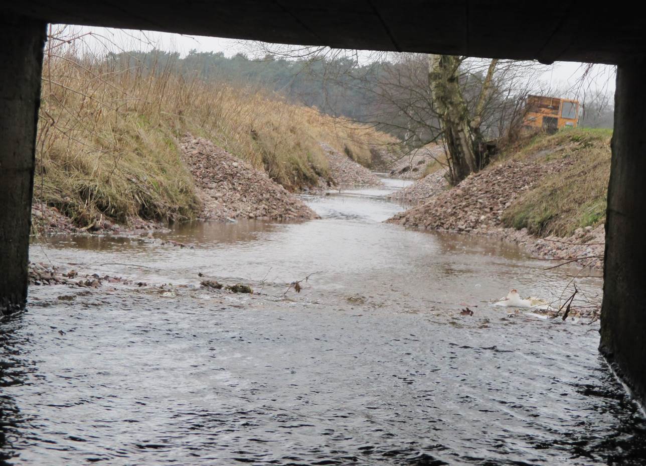 Eigentlich sollte hier eine abwärts vom Hochwasserkolken liegende Rausche mit Einengung den Abriss unter der Brücke auffangen, damit Fische und Wirbellose „einsteigen“ können.