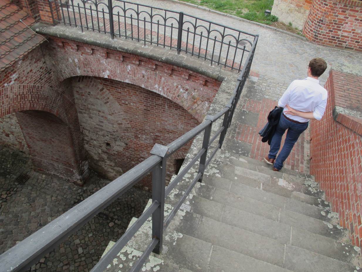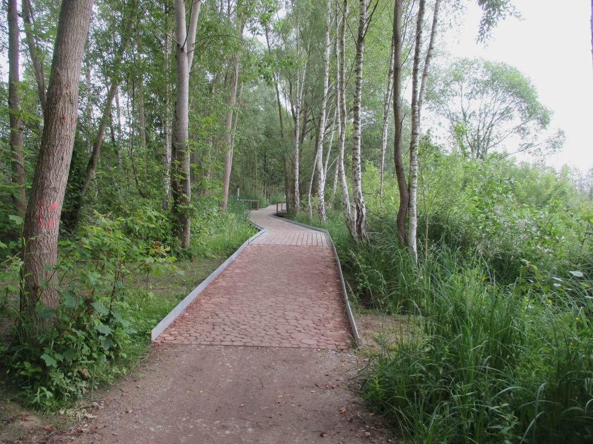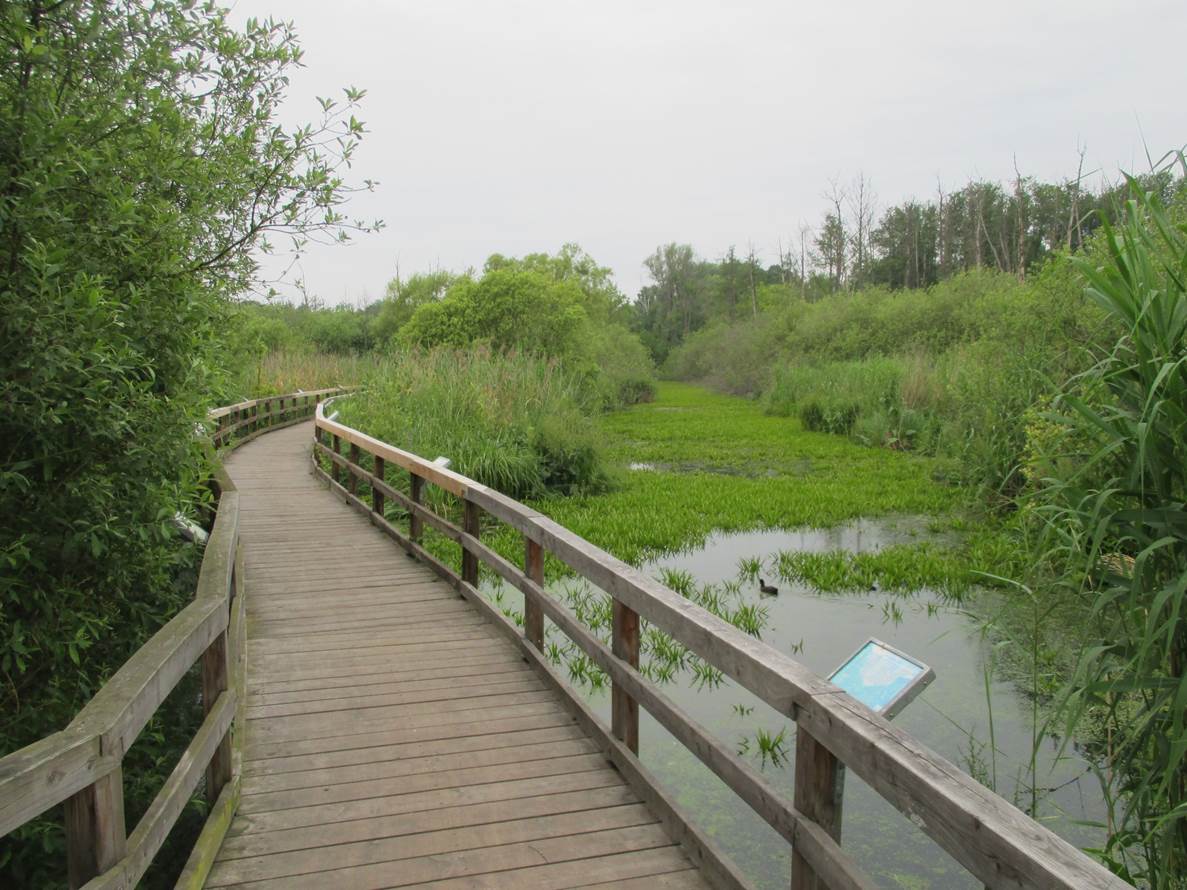Warum, warum – ist der Steg hier krumm? Plötzlich macht der Steg einen Bogen, eine grüne, gerade Trasse liegt daneben.