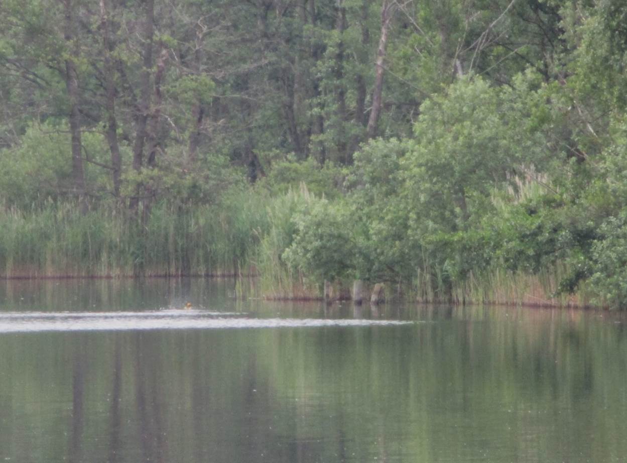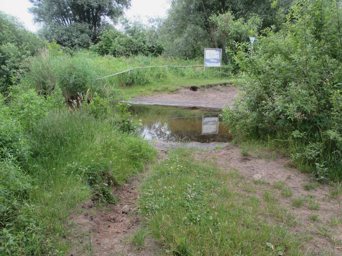 Wir haben die Moräne verlassen, treffen das Tegeler Fließ mit einer Furt und nebendran (im Foto hinter den Bäumen verborgen) einer Fußgängerbrücke.