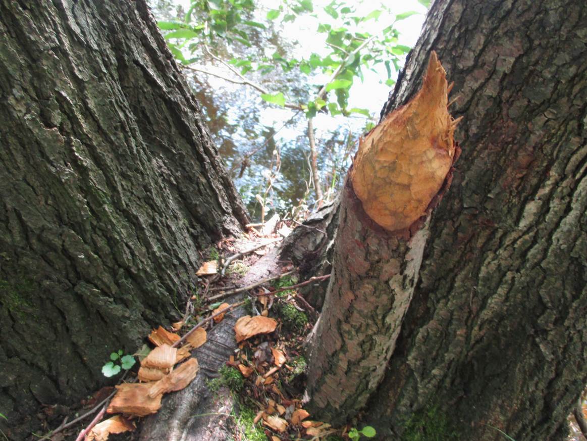 Nicht allzu fern hat auch ein Biber seit geraumer Zeit seinen Unterschlupf gefunden, wie solch typisches Anzeichen verrät.