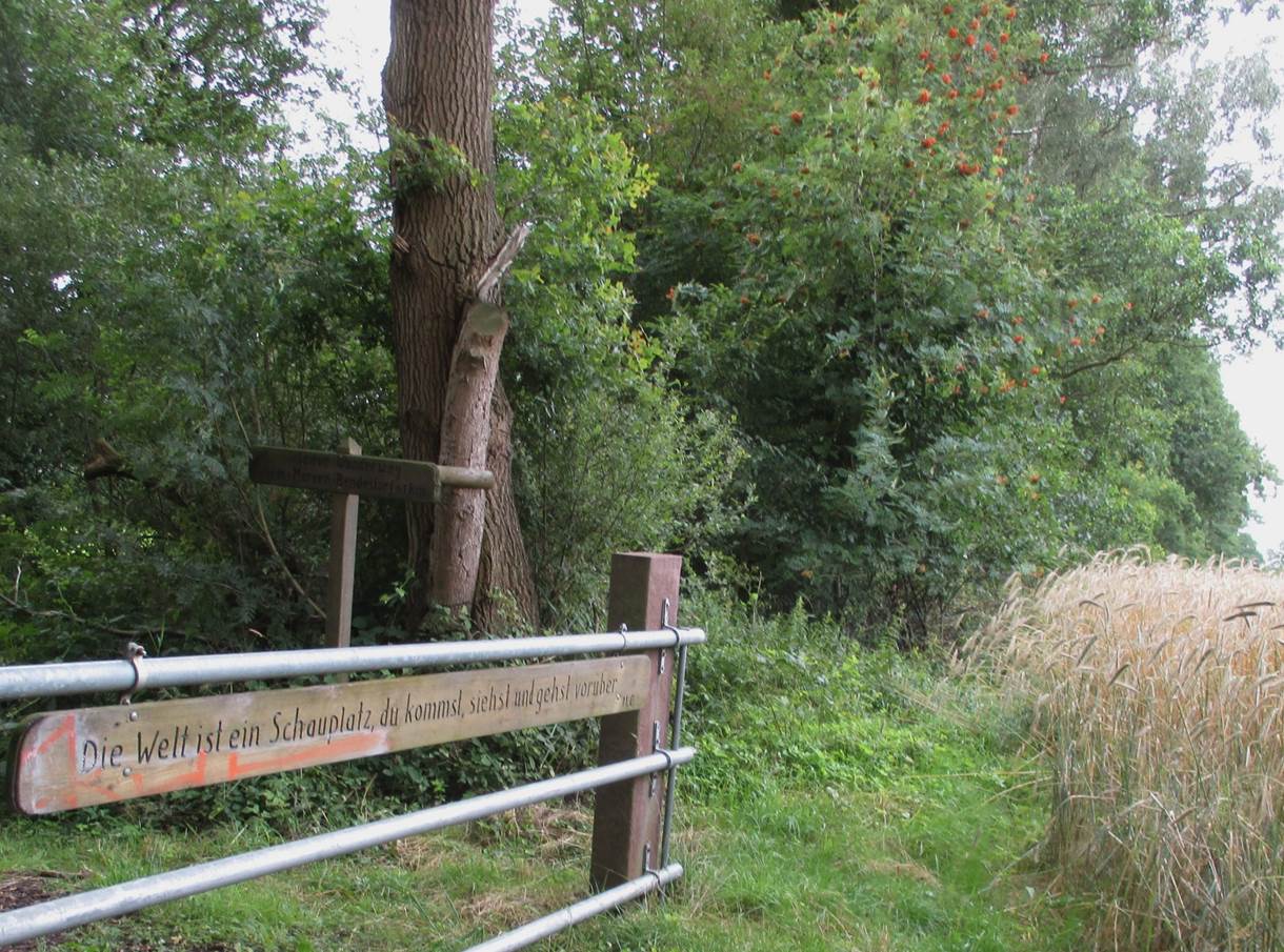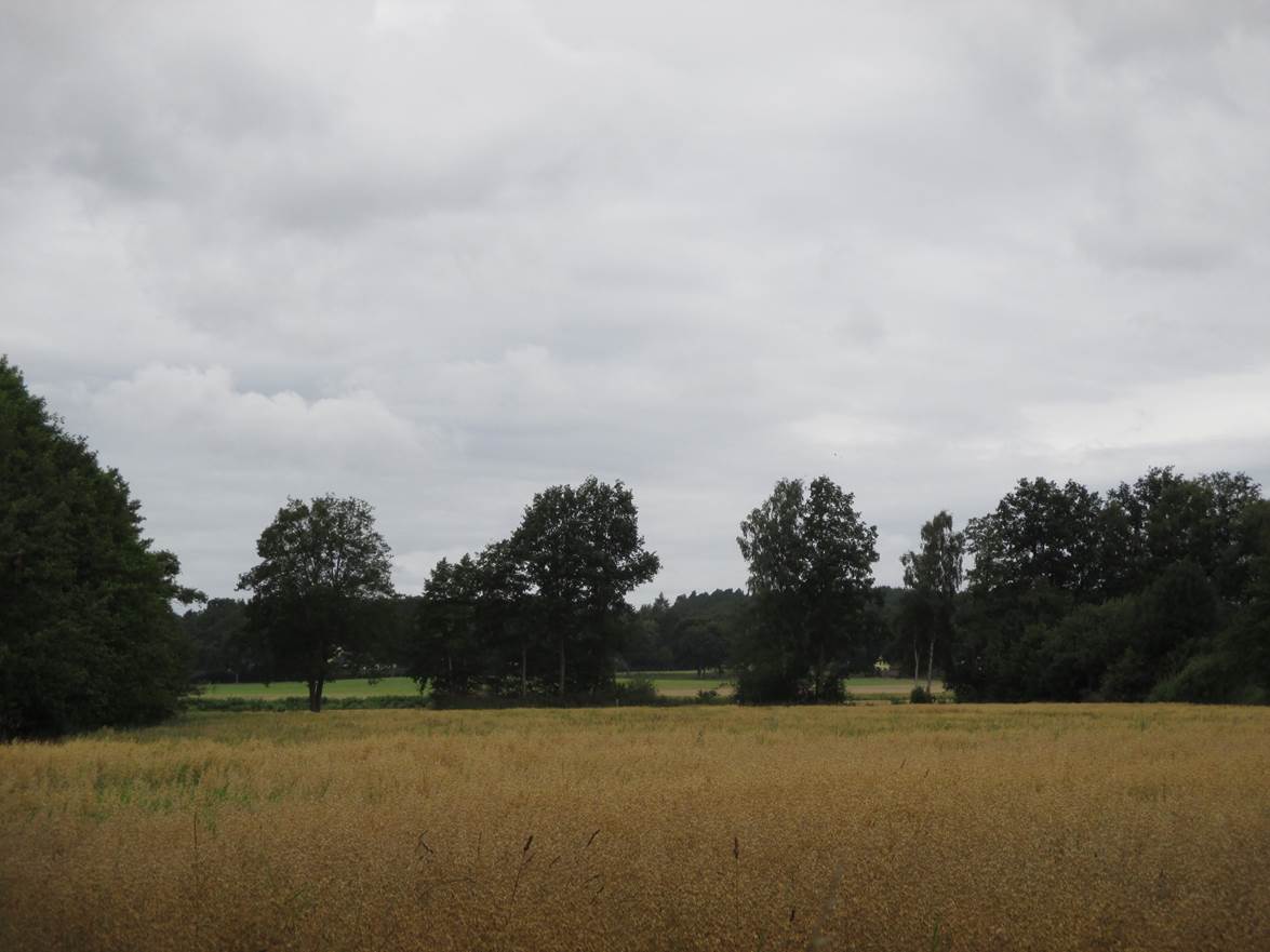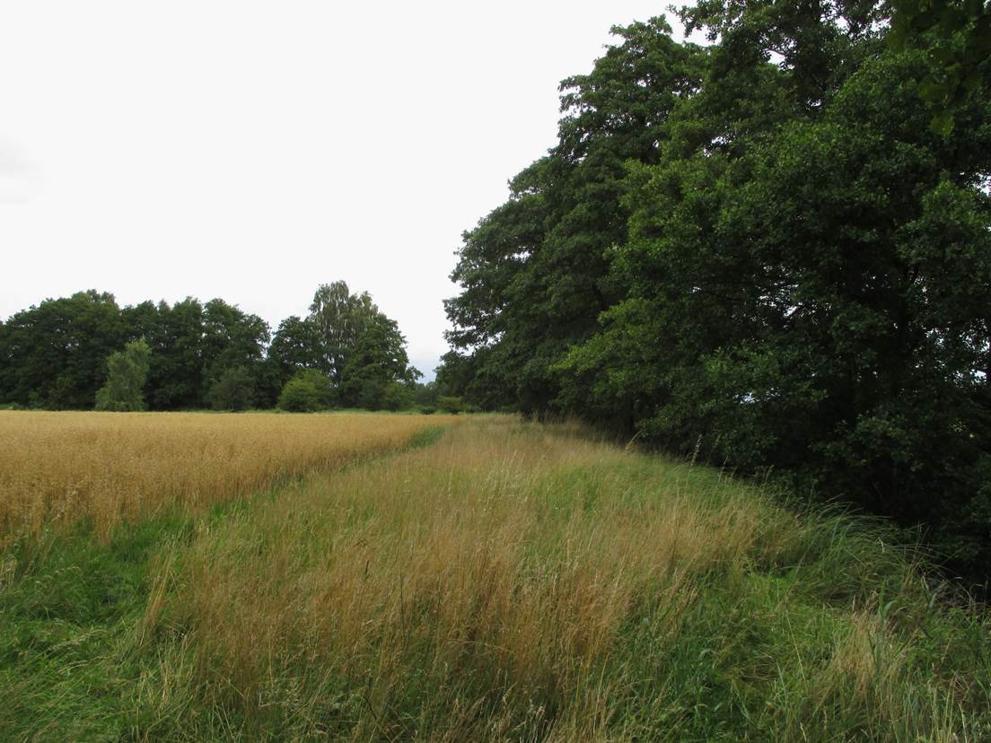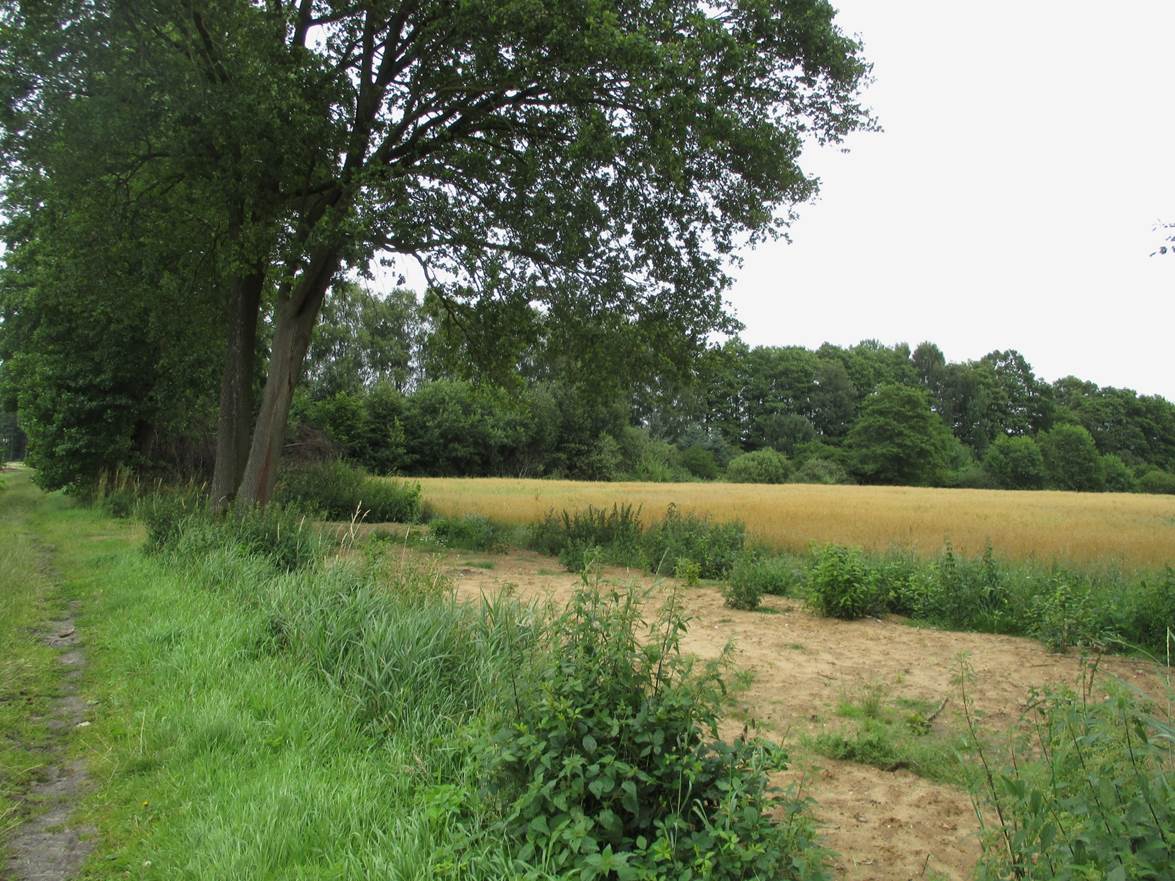 Links vom Weg ist jüngst Grünland zu Acker, momentan Hafer-, umgebrochen worden. Dabei wurde der Knick beseitigt, Bäume reduziert und die ehemalige dreidimensional grüne Fläche mit Boden aufgefüllt.