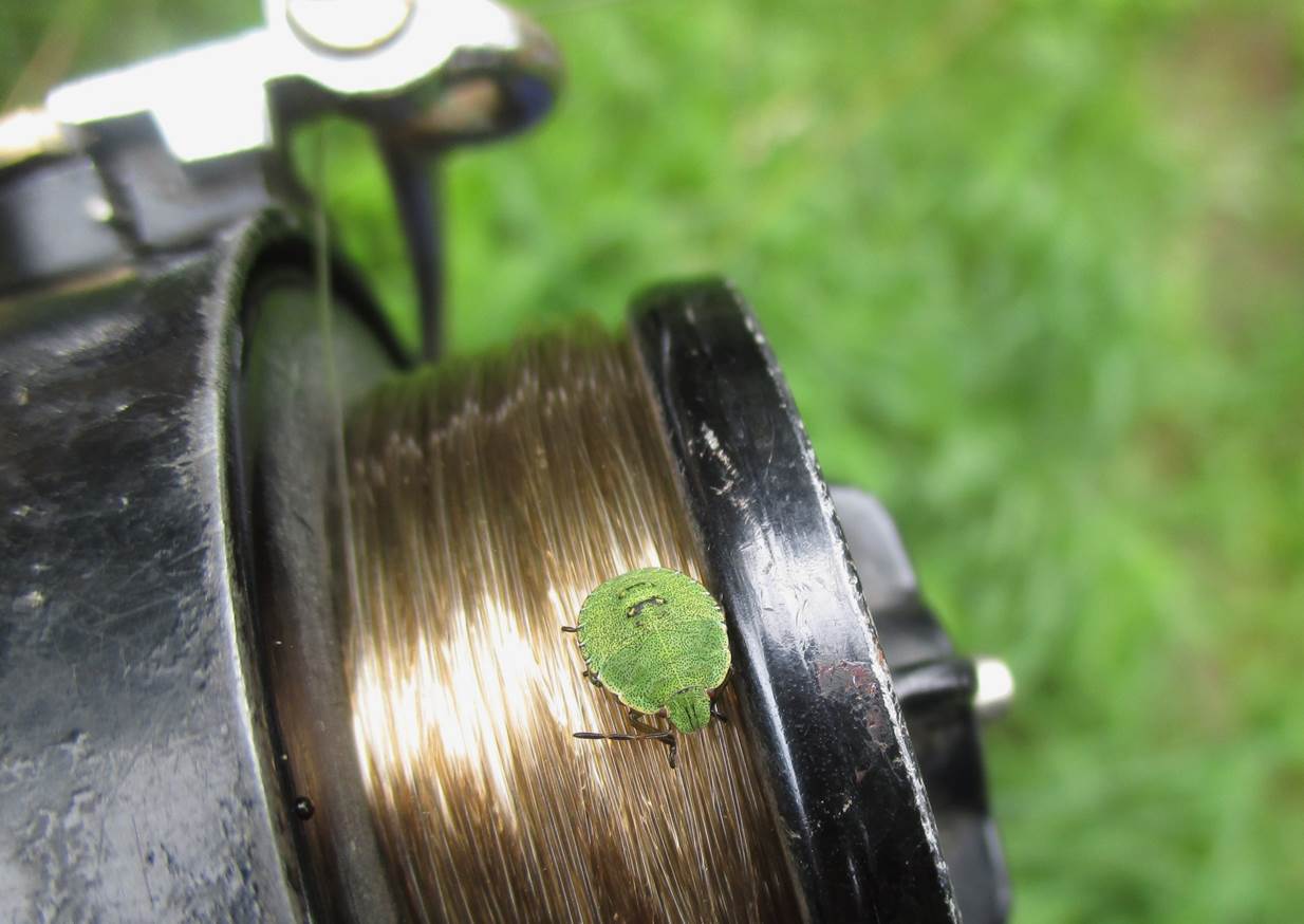 Grünes auf der uralten, bewährten Mitchell-Rolle – eine Schildwanzenlarve, möge der Tag bunt werden.
