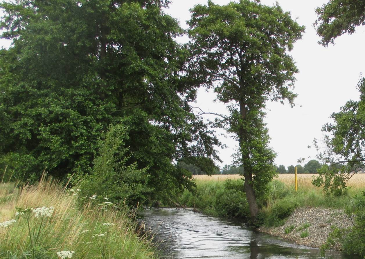 Vom Gewässer ins Land geschaut ist am Horizont der ausgedünnte Baumsaum mit fehlendem Knick zu erkennen.
