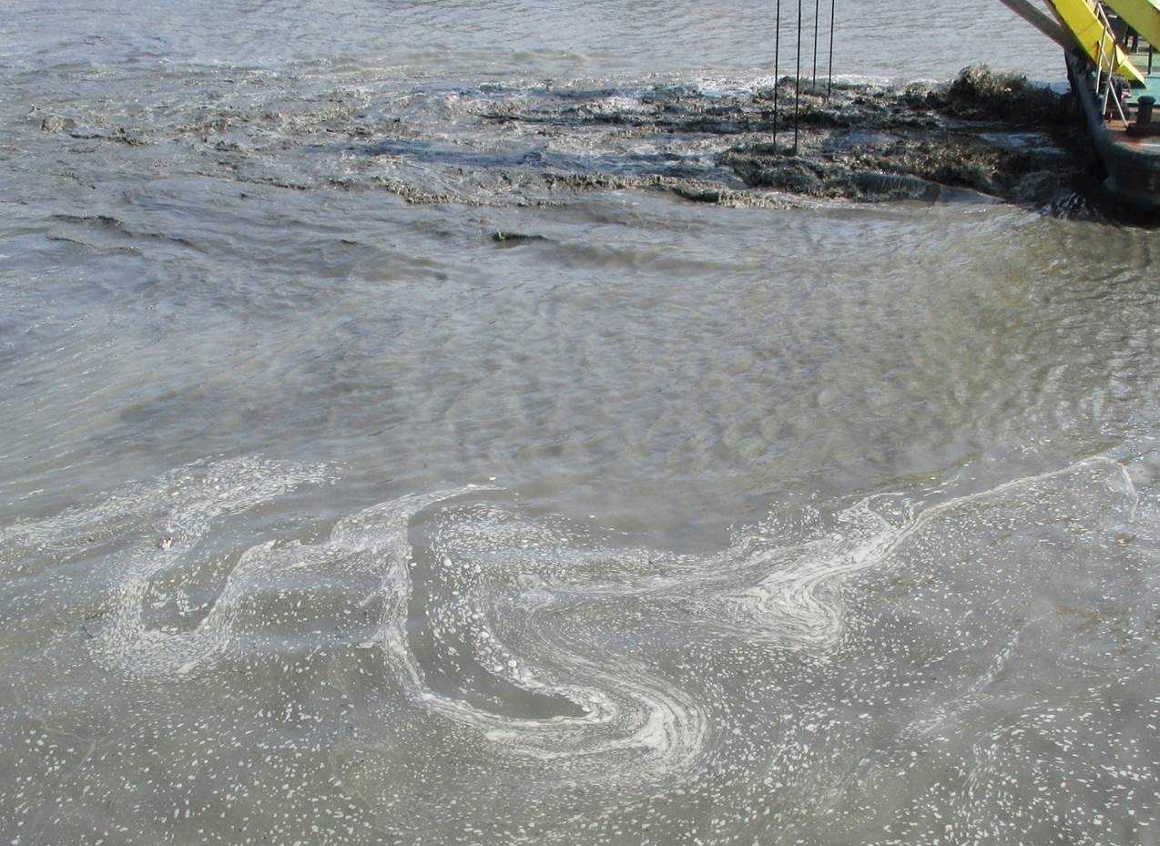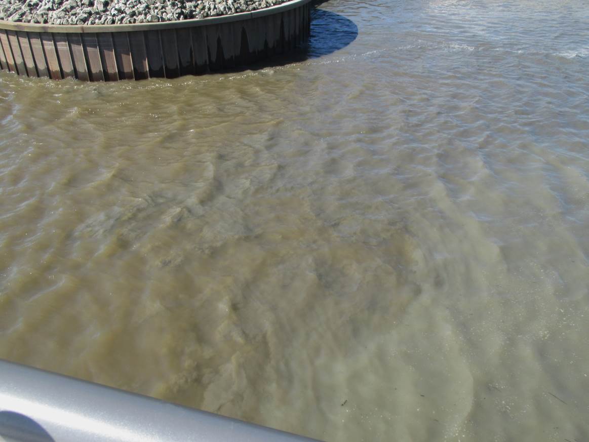 Der frische Südostwind treibt aufgewühltes, entmischtes schwimmfähiges Material ans nördliche Hafenende.