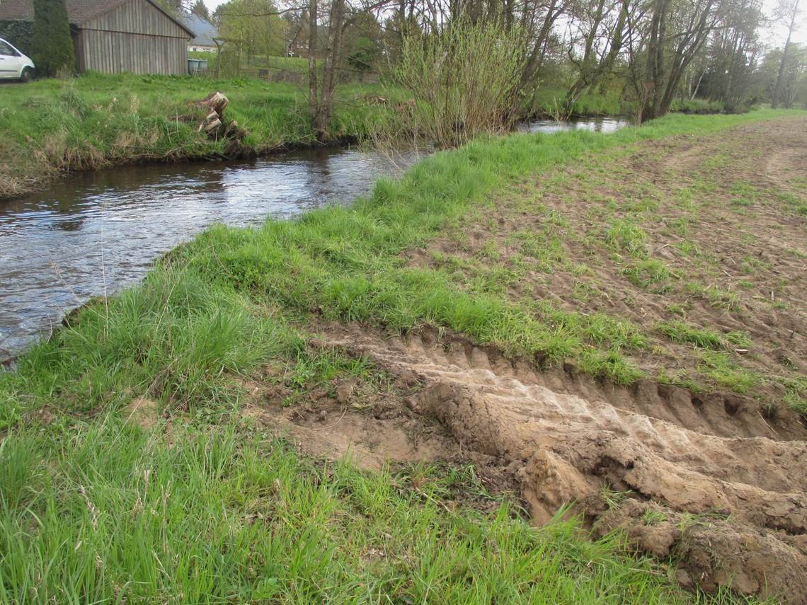 Die Folge jahrelangen Abpflügens des halben Wurzeltellers früher hier vorhanden gewesener, standorttypischer Großbäume in gewässerbegleitendem und beschattendem Saum: Totalverlust mit folgender Stark-Erosion – Landverlust beim Verursacher.