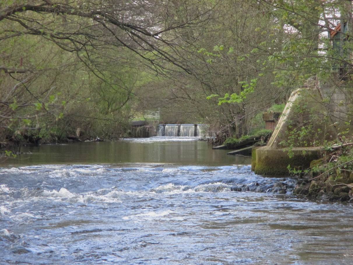 Seeve Maschen: Seeve-Wehr, durch Tiefenerosion entstandener Strömungsabriss am Fischpass, vorn die verschärfte Strömungssituation an der Fußgängerbrücke – leicht aufzufangen durch abwärts anzulegende Rauschen aus Kies/Geröll.