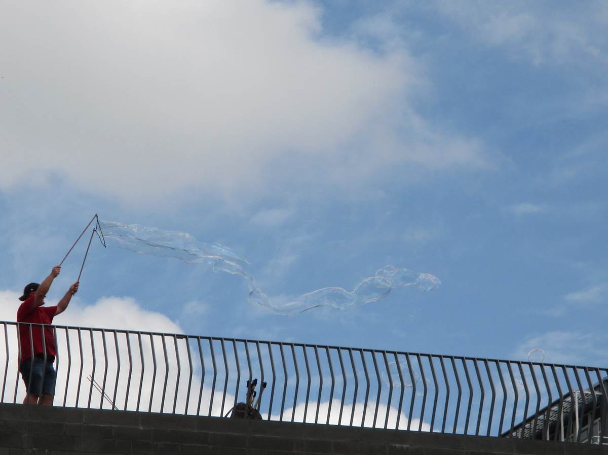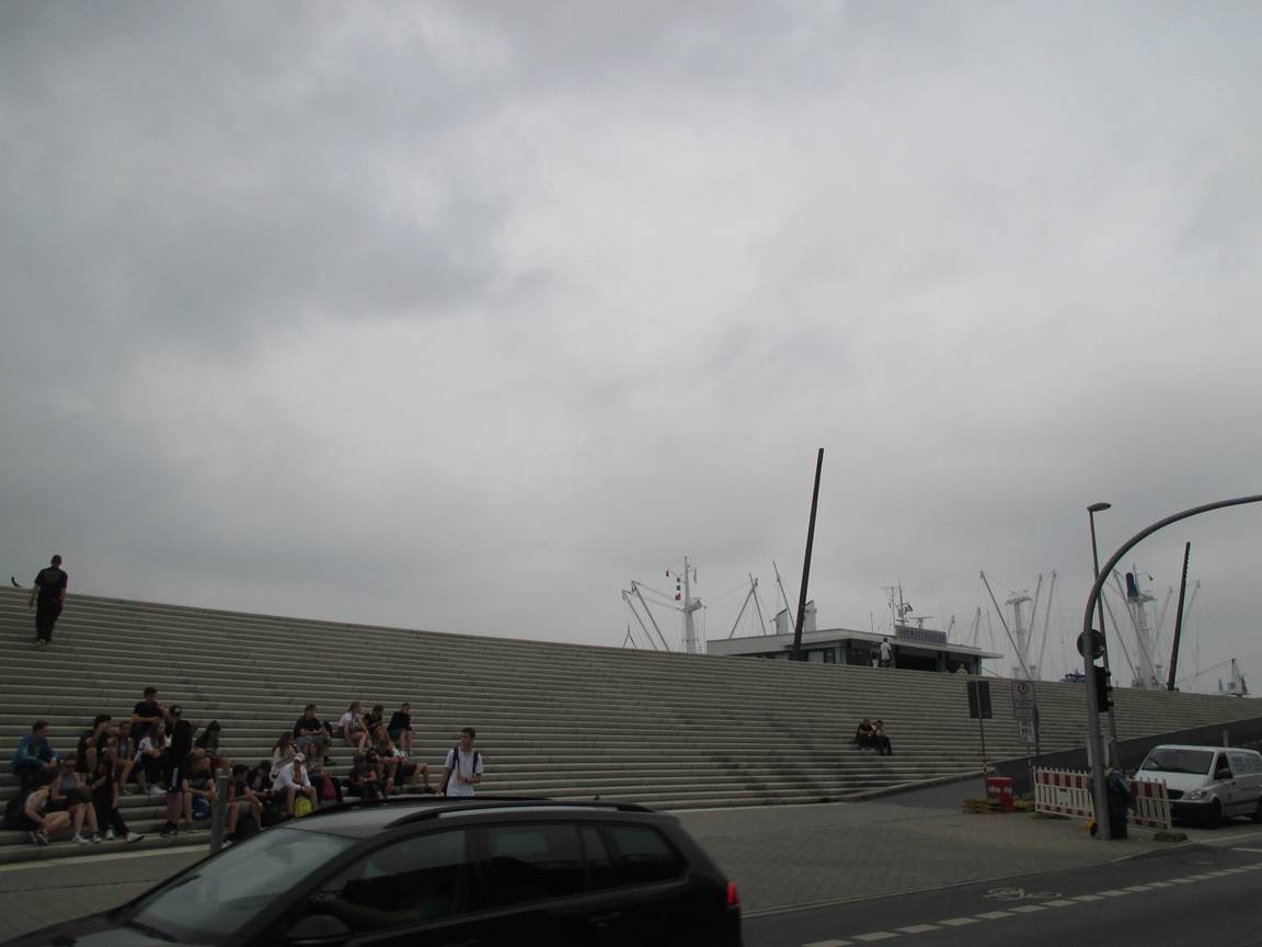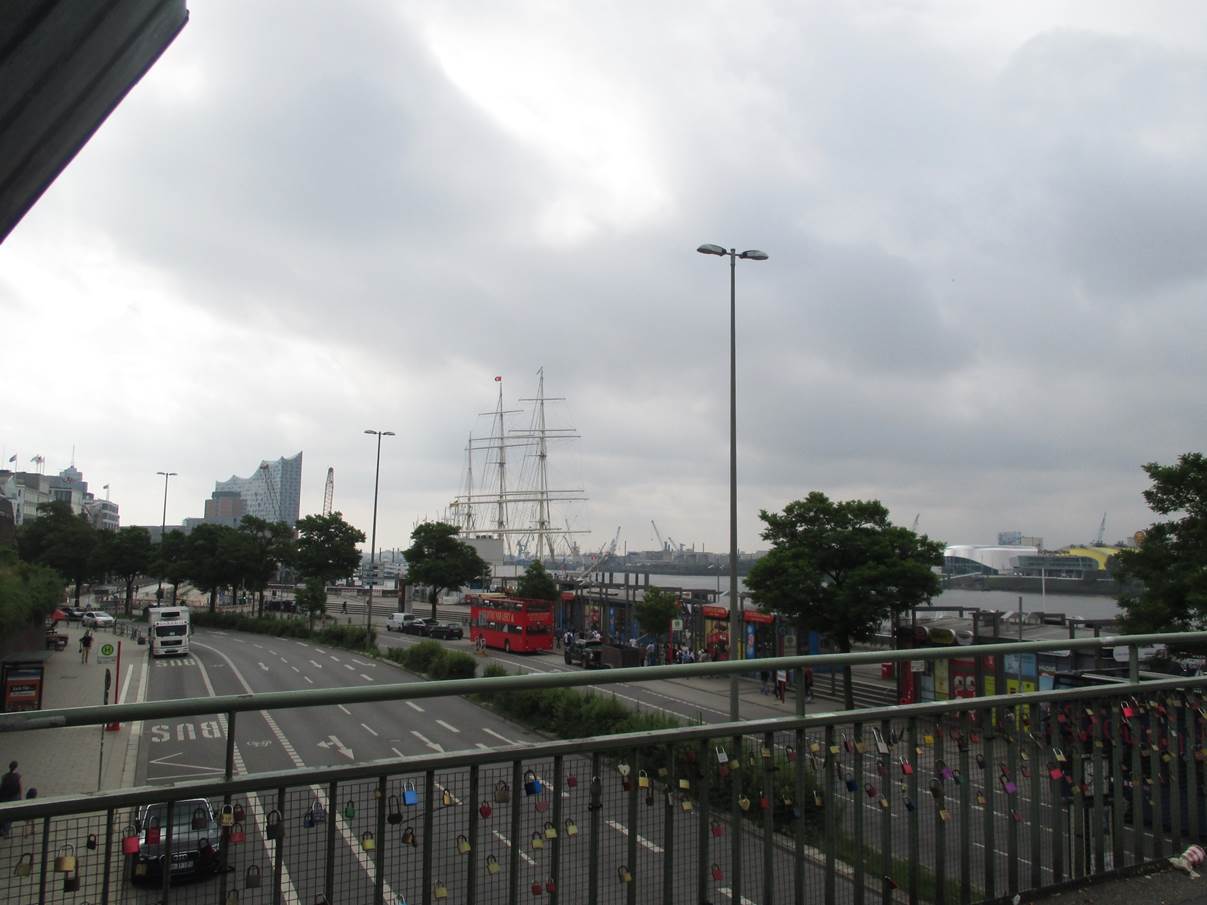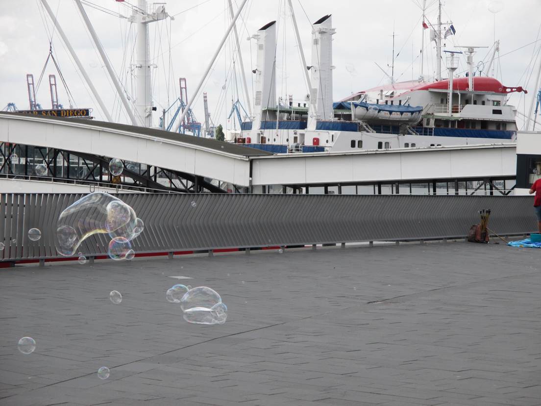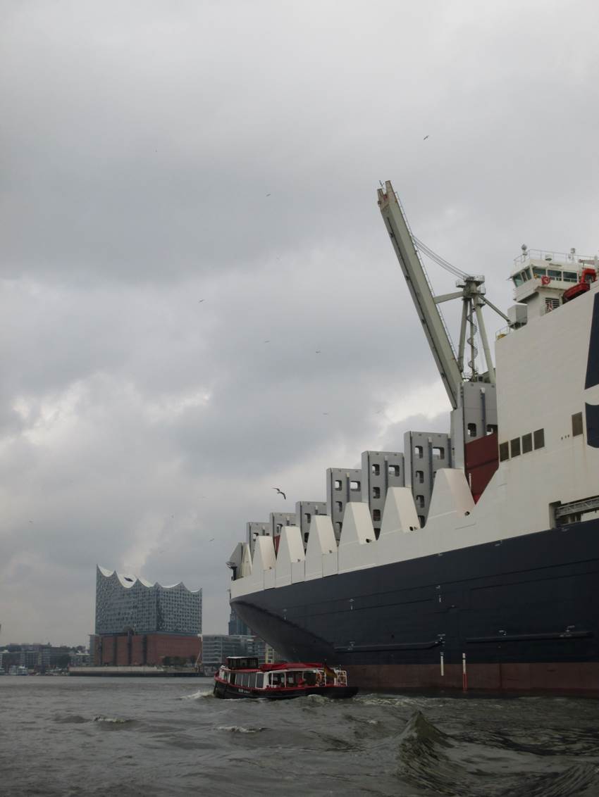 Natürlich floriert der Containerverkehr, die großen Schiffe können – erkennbar auch ohne weitere Elbvertiefung – abgefertigt werden. Ganz klein staunen wir hinauf.