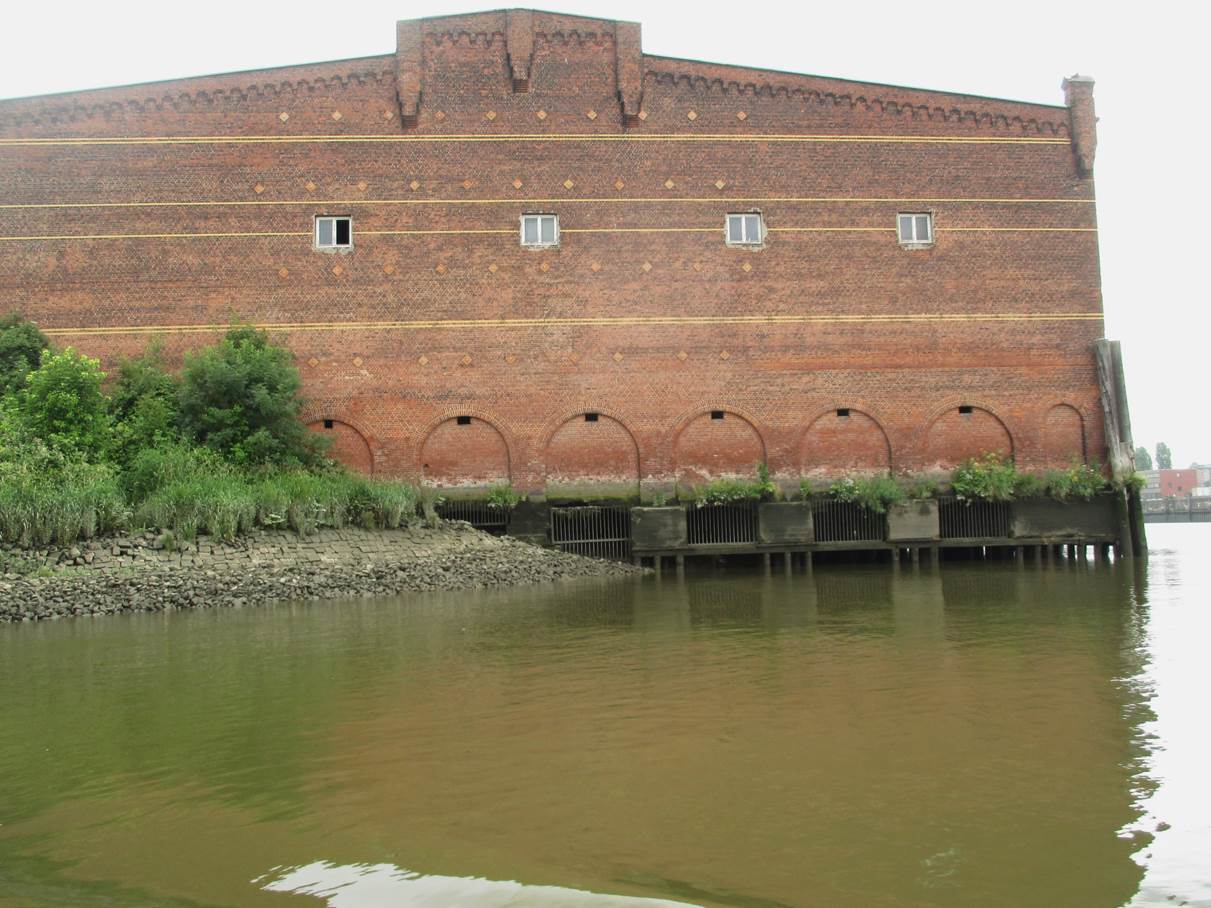 Und im Osten wieder raus, in den Saalehafen – Blick auf ein Zeugnis grausamer Vergangenheit. Hier waren Inhaftierte des KZ Neuengamme für Arbeiten im Hafen untergebracht.