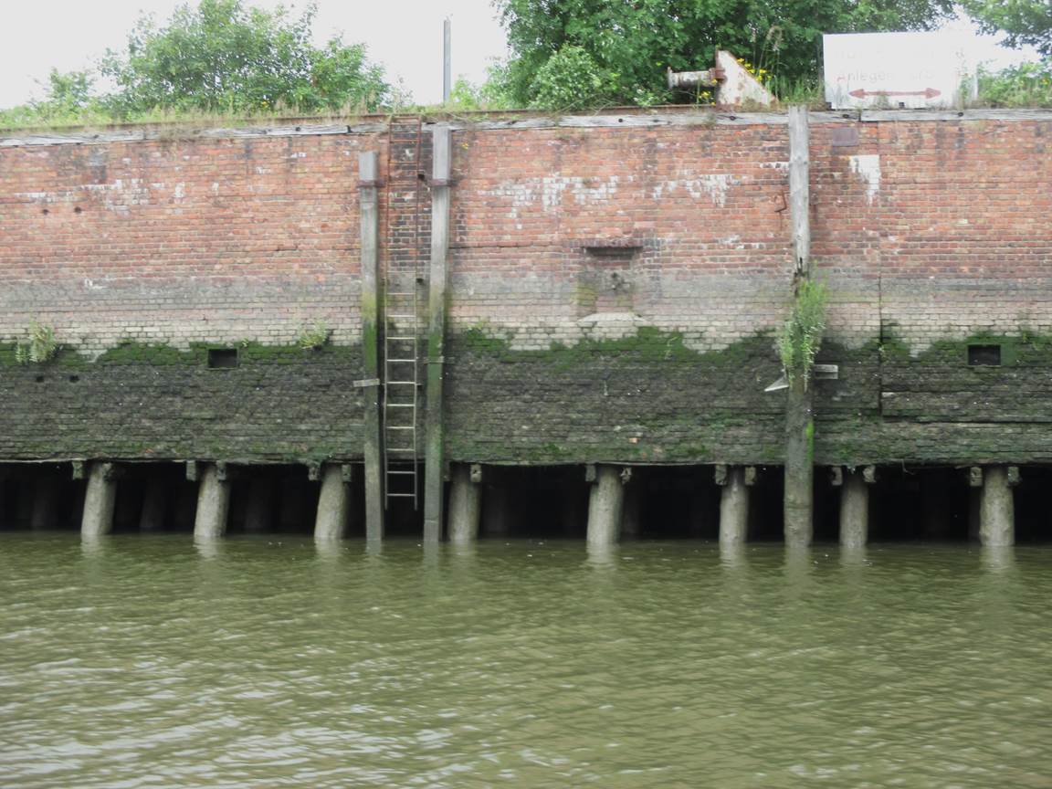 Vorn stand „Zum Einen …“, hier also „Zum Anderen …“ – das durch ständige Elbvertiefungen weggelaufene Wasser (Absenkung des Tideniedrigwassers) lässt die Pfahlgründungen trocken fallen. – Sauerstoffkontakt führt zu optimalem Kompostieren der früher wassergeschützten Pfahlgründungen.