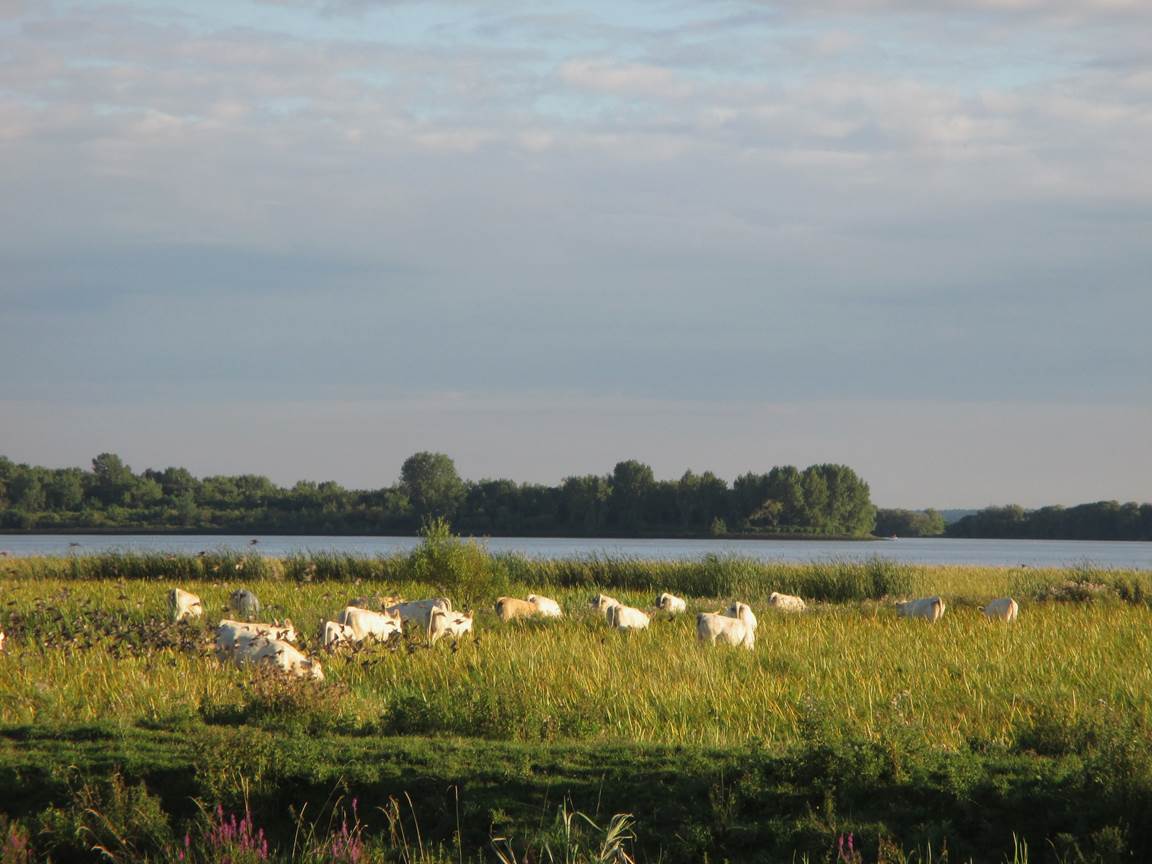 Diese weisse Herde war schon in einem anderen Blog-Eintrag zu sehen. Hier erhebt sich links im Foto gerade ein Starenschwarm, der von der Bewegung der Rinder profitierte.