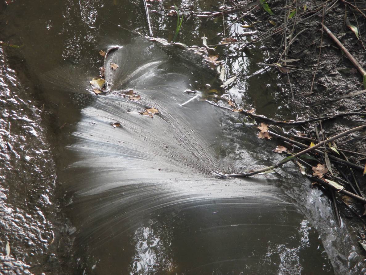 Ein Bakterienfilm, der irgendwo im System Wasserfläche bedeckte, ist mit ablaufendem Wasser abgerissen. Hier an Ästchen und Blättern im schmalsten Abflussquerschnitt wurde er aufgehalten und fächerartig zusammengeschoben. – Man wundert sich über solch Erscheinungsformen im Kleinen.