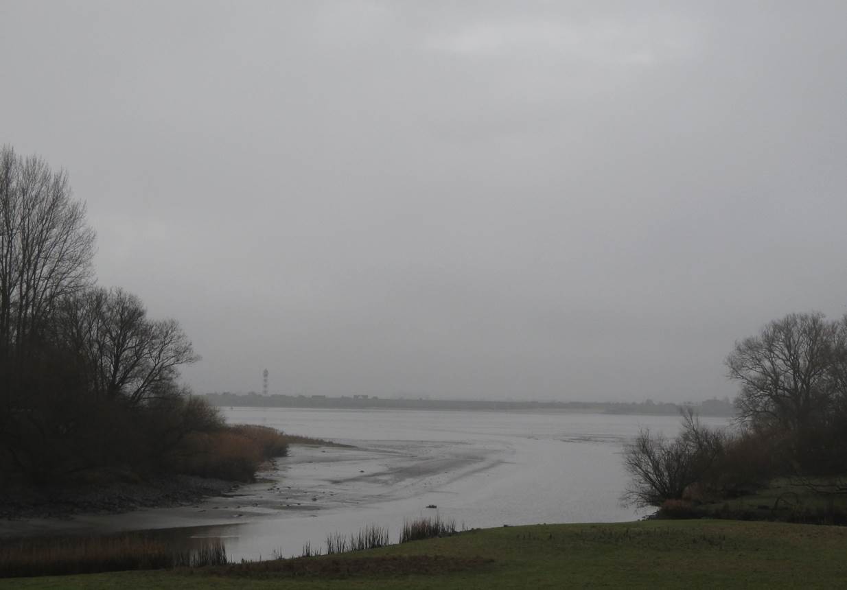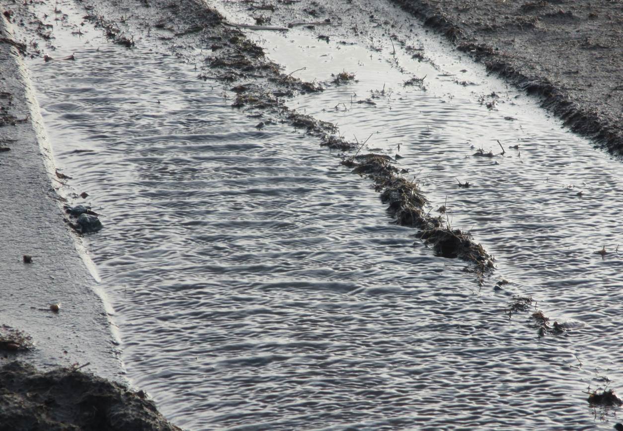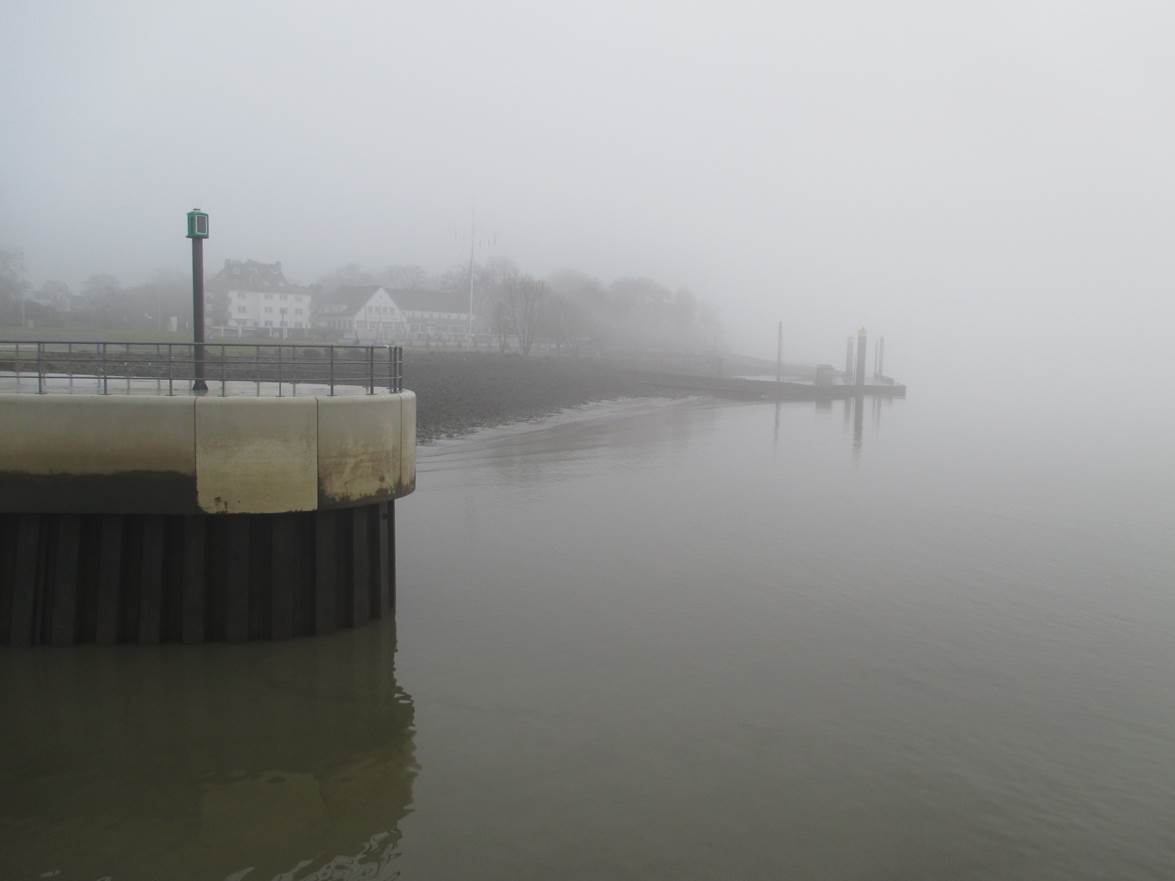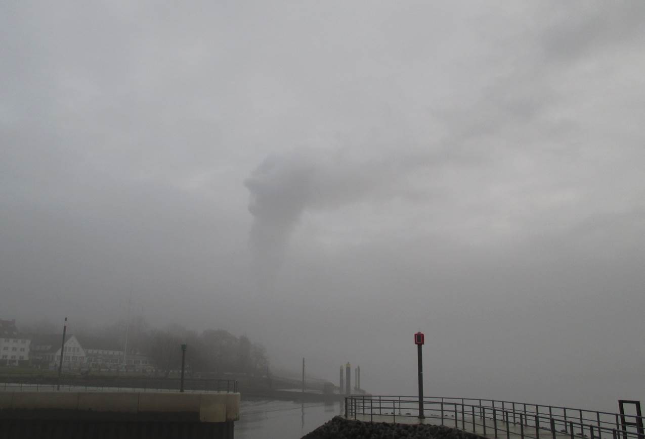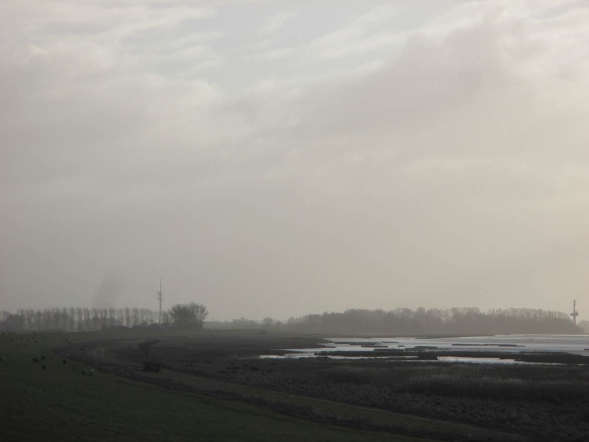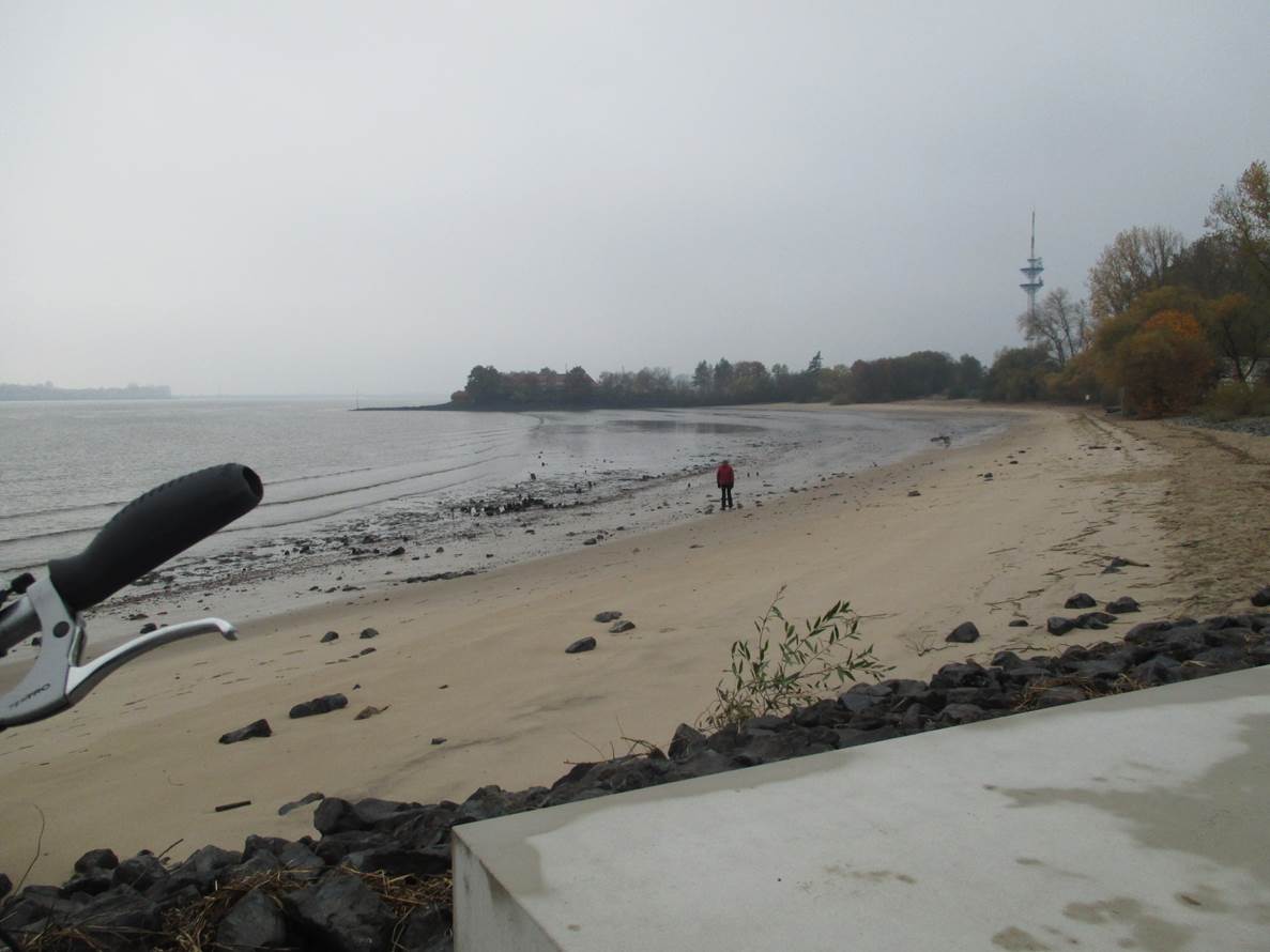 Sturm im Wasserglas? Nein, in einer Fahrspur neben der Deichverteidigungsstraße. – Bis hierher bin ich gegen den Sturm zeitweise im 1. Gang gefahren. Ab jetzt habe ich Rückenwind – der 7. bringt mich voran.