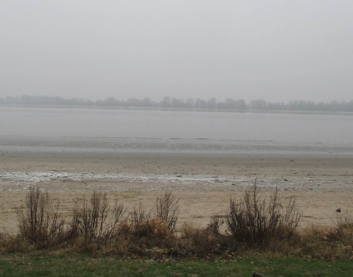 Wedels Küste, Blick nach Osten – schemenhaft am Horizont liegt ein Schiff quer, vermutlich die Ijsseldelta. Gleich klappt sie ihre Hafenfracht in die Elbe – muss schnell zurück, sonst ist die Fracht schneller wieder da … (so sagte jedenfalls ein niederländischer Saugbaggerkapitän).