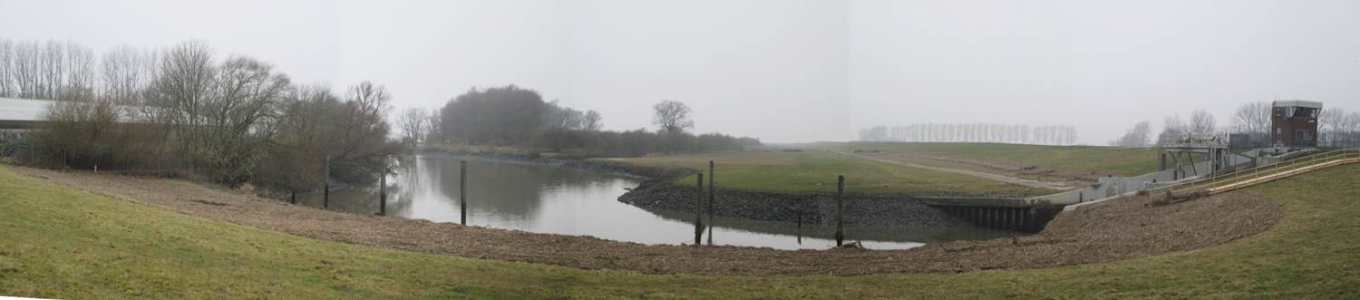 Saubere Sturmflutarbeit am Sperrwerk Wedeler Au – zerriebenes Röhricht liegt als halbkreisförmiger Teppich sauber platziert.
