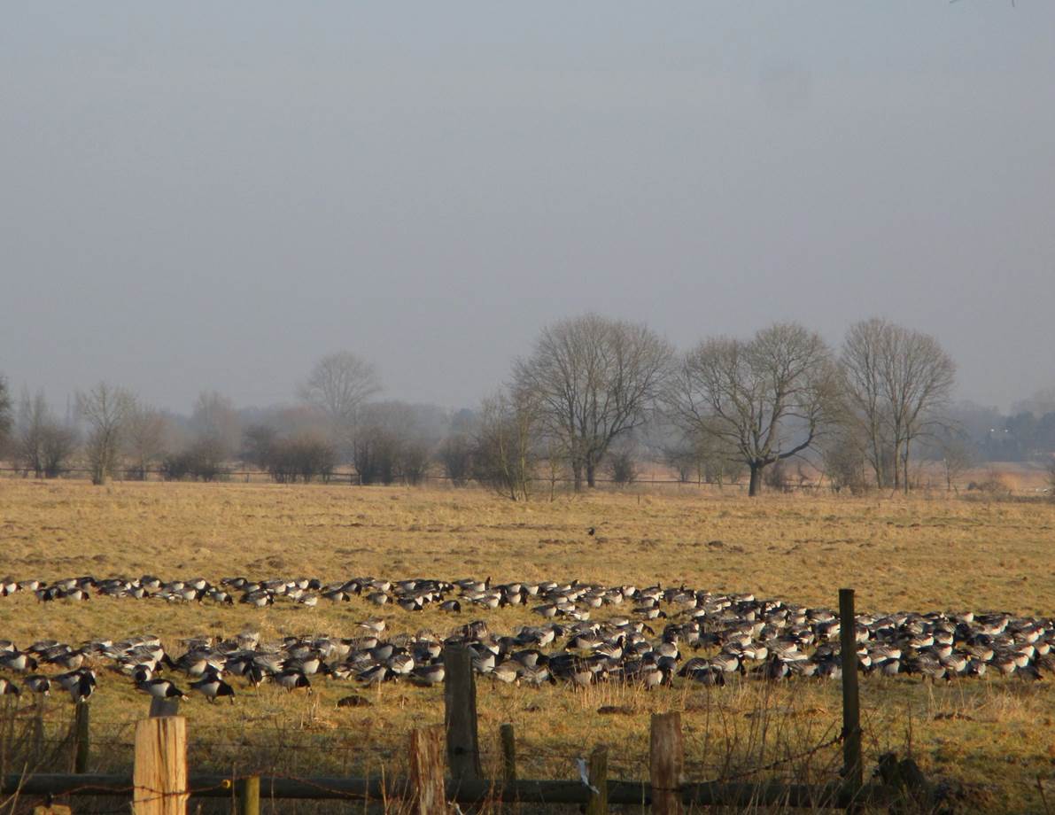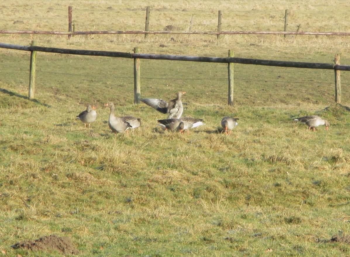 An geschützter Stelle zwischen Bauernhaus und Pferdestall lassen es sich Graugänse in der Wintersonne gut gehen.