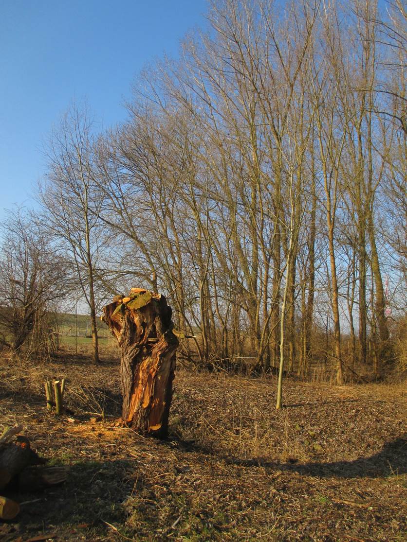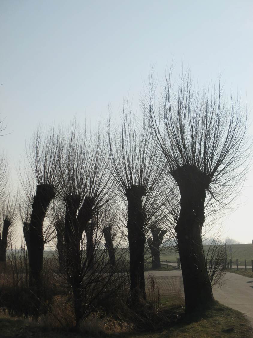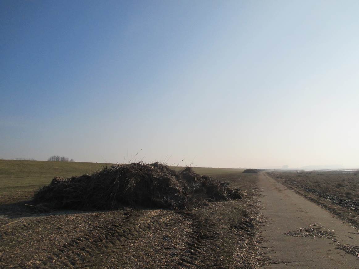 Deichfront zur Elbe – der Frostboden ermöglicht, die bei Sturmfluten angelandeten Röhricht-Treibselmassen zusammenzuschieben.