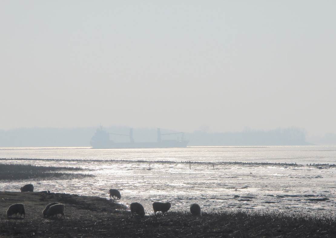 Bei dieser niedrigen Tideniedrigwassersituation (Schaf vor Buhne auf Süßwasserwatt) ist die gesamte Elbwassermenge auf den seeschifftiefen Schifffahrtskanal konzentriert.