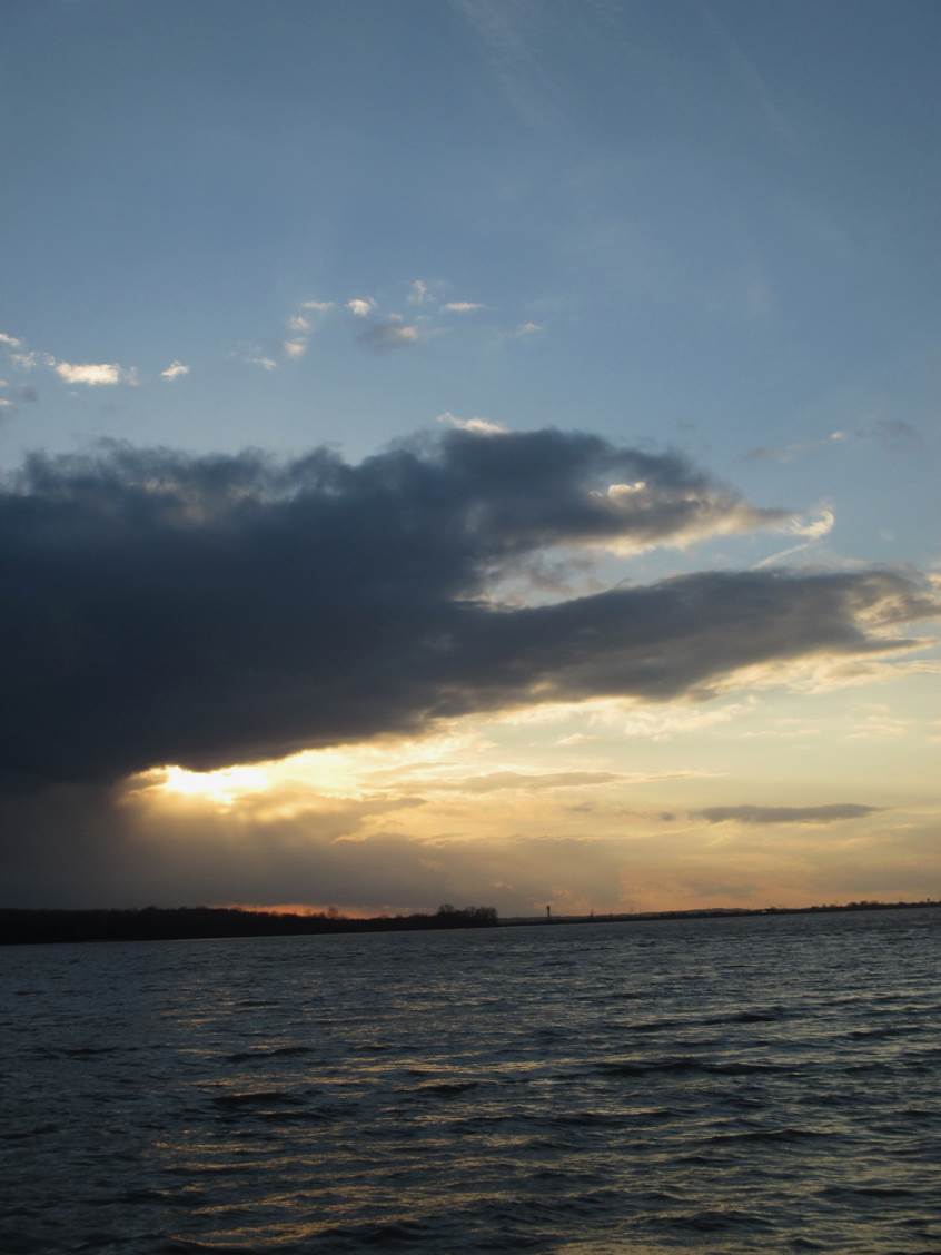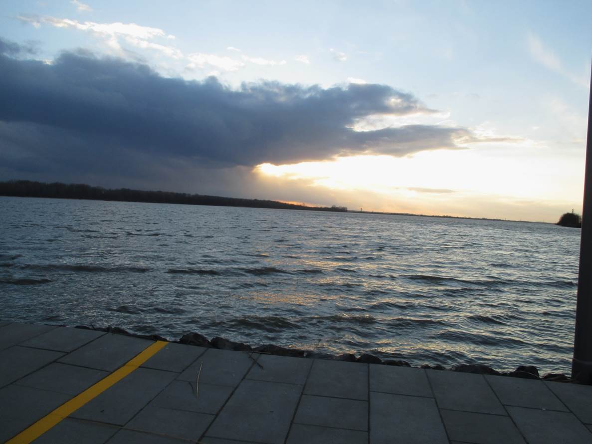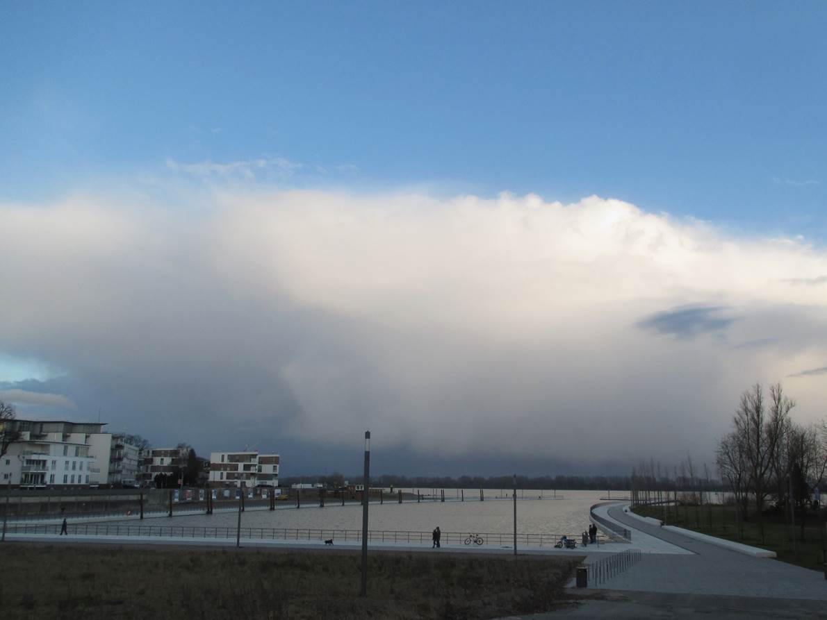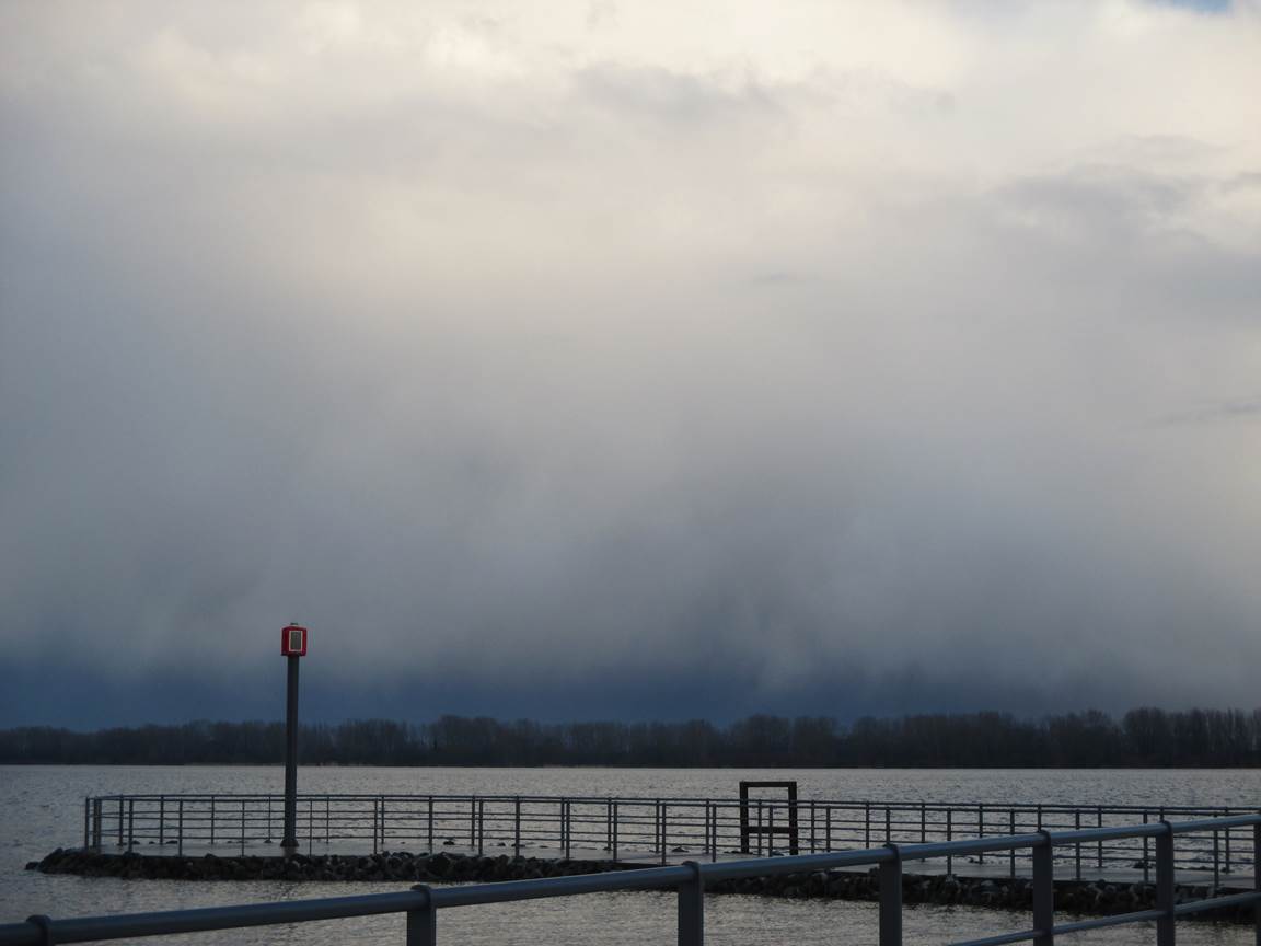 Am Schulauer Hafen angekommen – Tidehochwasser plus X. Jenseits der Elbe, in Niedersachsen, rast offenbar ein größerer Graupelschauer durch. Wie gut, dass ich am Nordufer unter blauem Himmel stehe.