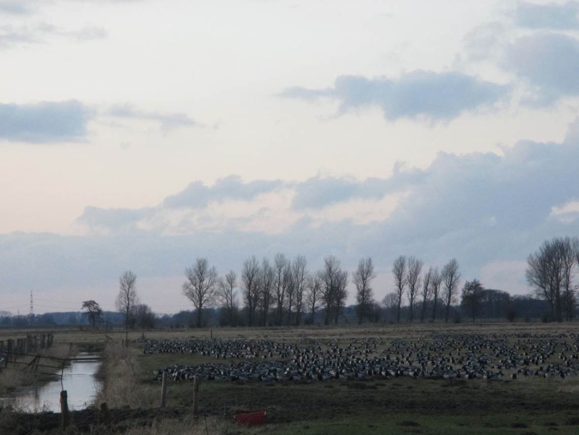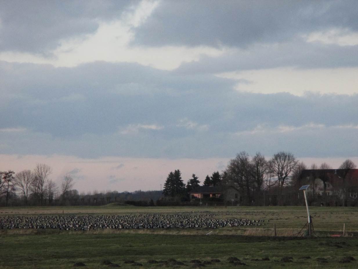 Querab Langer Damm grasen an die zehntausend Nonnengänse in der Dämmerung. Bald werden sie lärmend über den Deich aufs Wasser wechseln, um über die Nacht geschützt zu sein.
