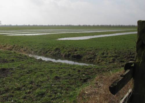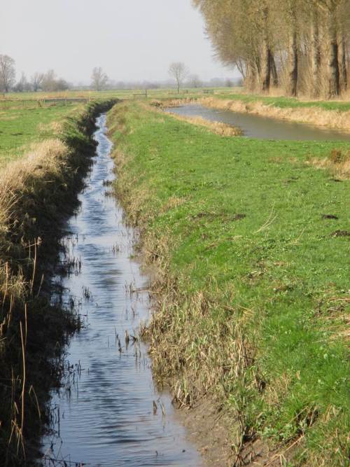 Sturmgebraus auf Marschgraben bei Tideniedrigwasser – daneben ein eingestauter Randgraben eines Wassergewinnungsgebiets.
