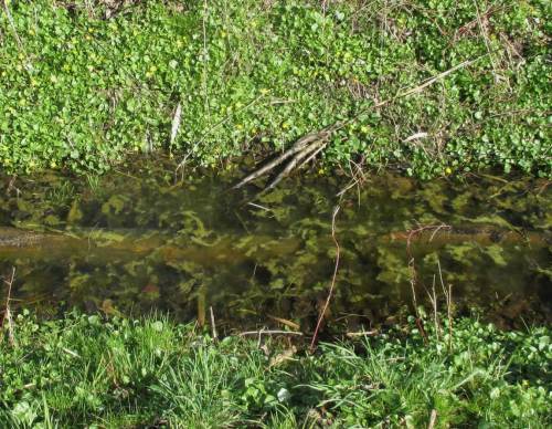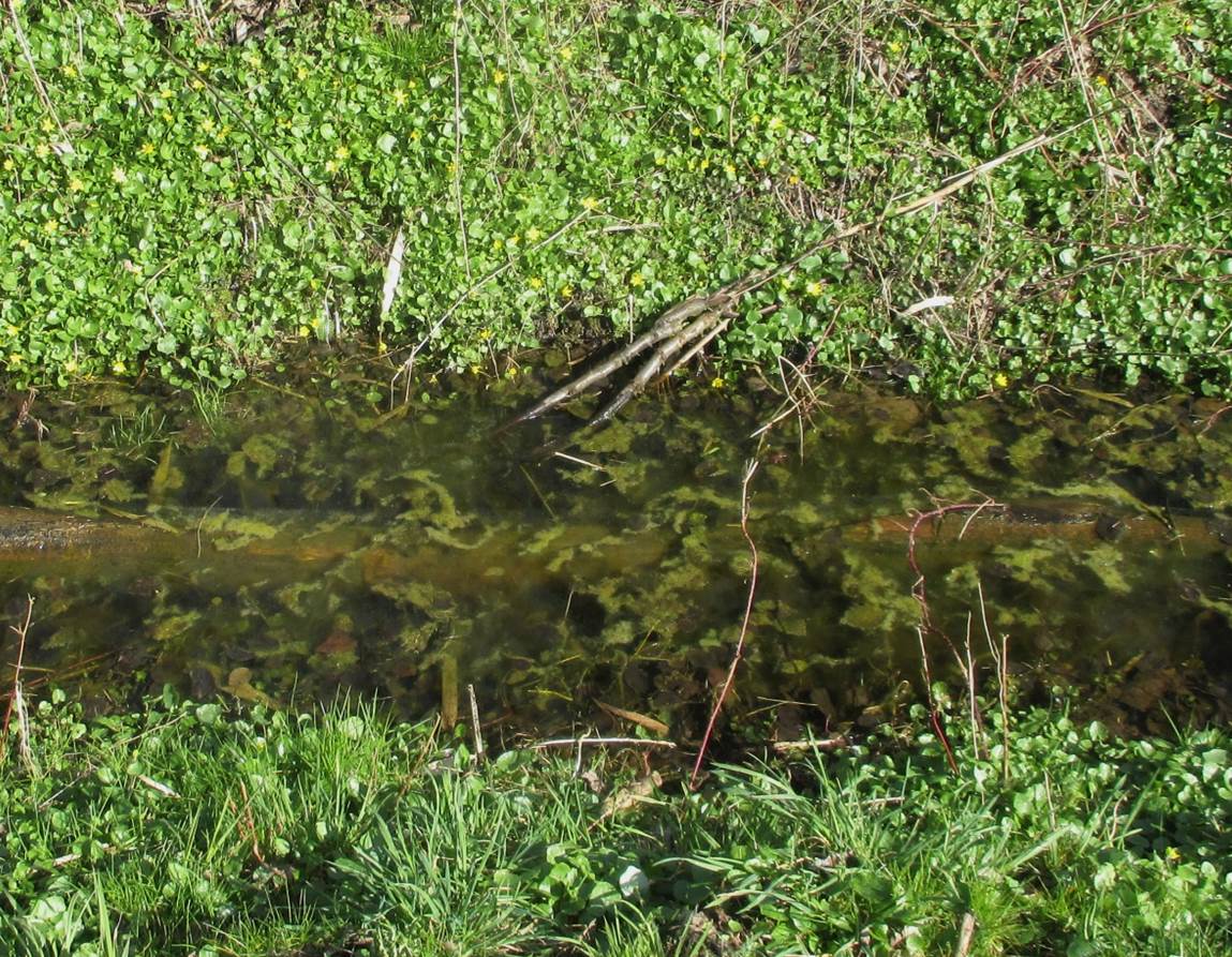 Der höhere Sonnenstand hat in Gräben dichte Algenmatten wachsen lassen – für Kaulquappen gedeckter Tisch. Die Amphibien sind inzwischen unterwegs zu den Laichgewässern.