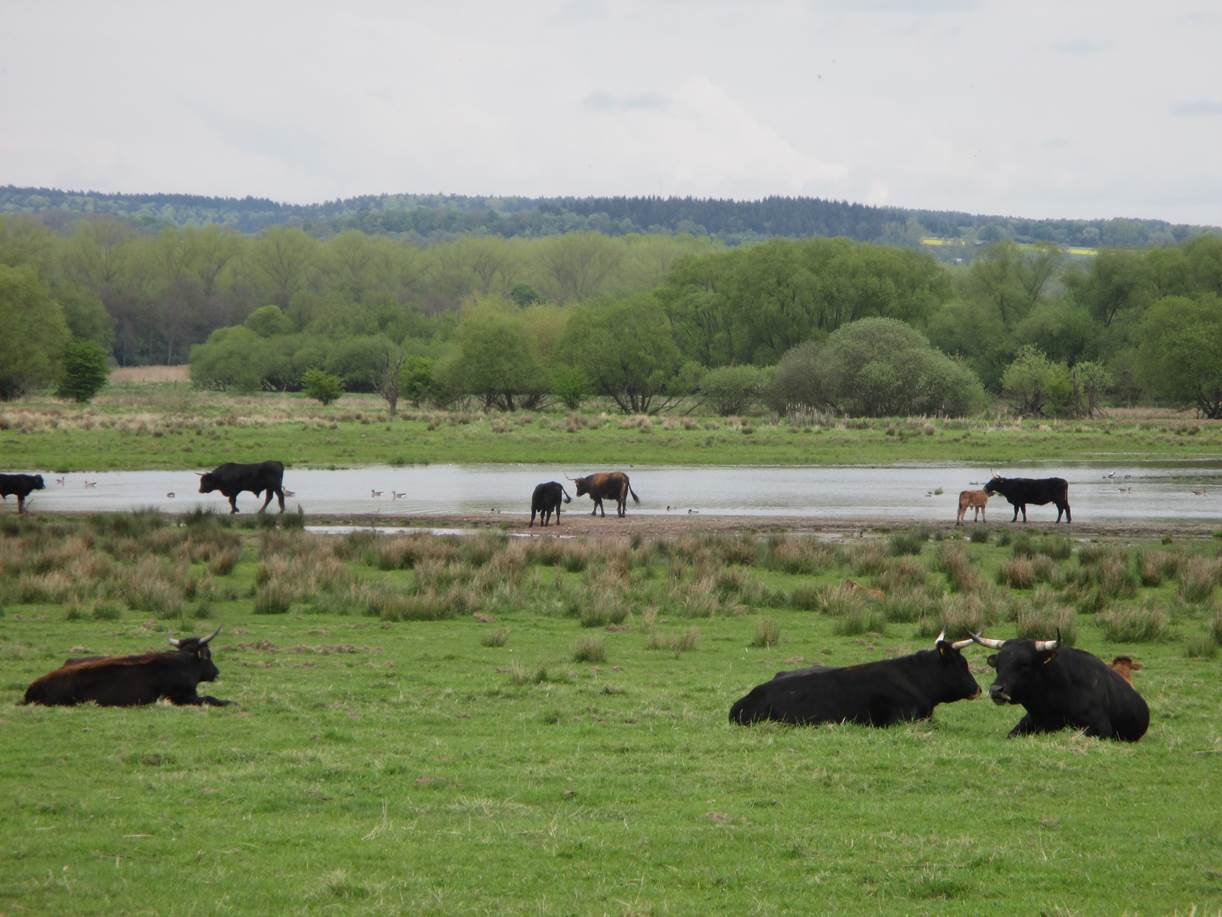 Beeindruckend, eine Auerochsenherde (auch Wildpferde beleben die Fläche) in offener Auenlandschaft. Wichtig aber zu beachten: geringe Viehdichte muss eingehalten werden – sonst ist das Ziel futsch.