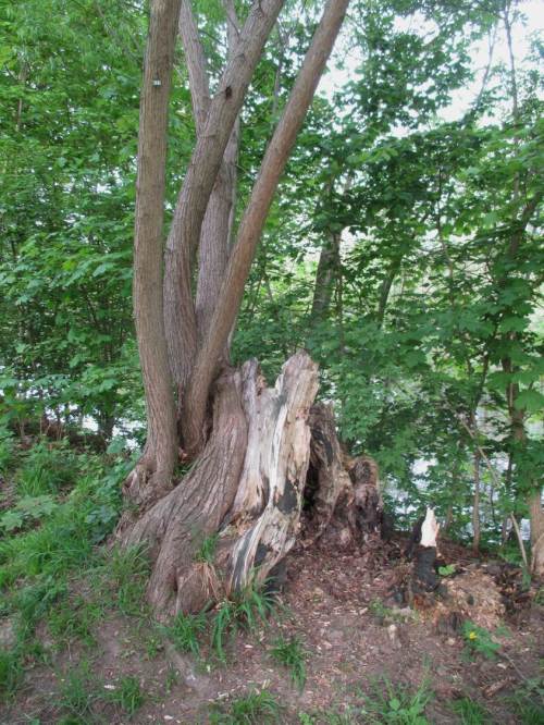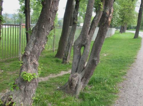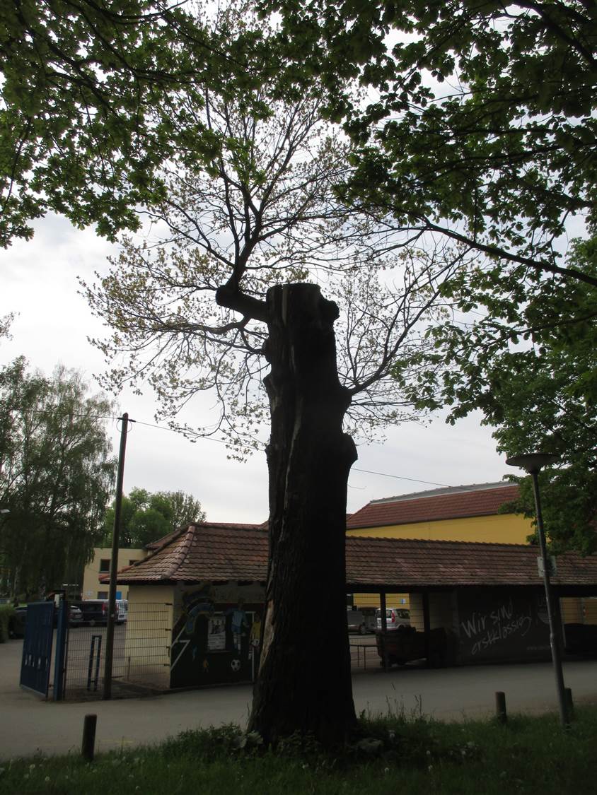 Denk-Mal – immerhin hat jemand Sinn für Zeichen der Zeit. Altbäume sind trotz Kappens aus Sicherheitsgründen etliche Meter hoch als Stamm erhalten.