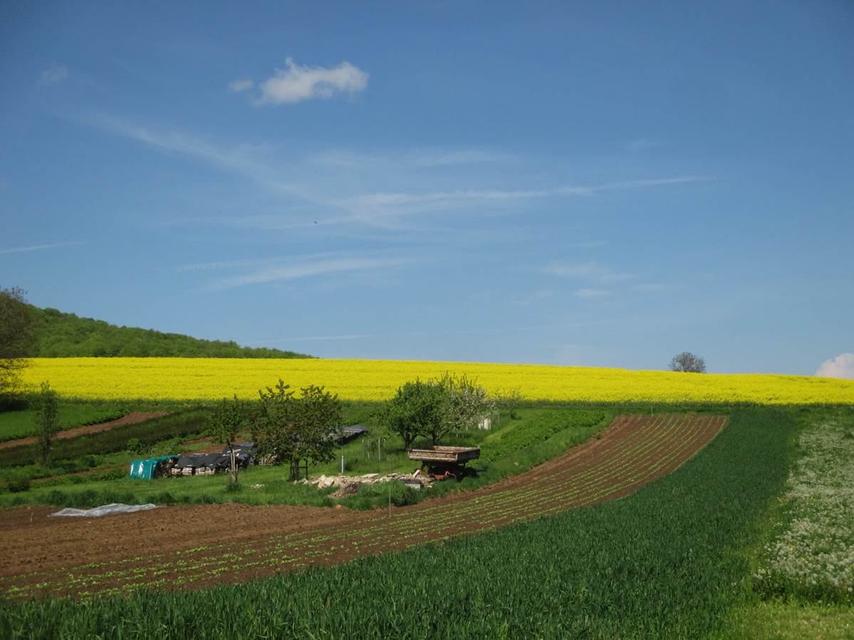 Beim Süd-Nord-Queren von Tälern und Höhen ist die intensive Nutzung der Landschaft deutlich. – Nötig wäre eine Änderung der Agrar-Subventions-Definition, damit wieder Feld- und Wegraine flächig zurückgewonnen würden.