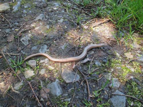 Eine Blindschleiche sonnt sich mitten auf dem Weg.