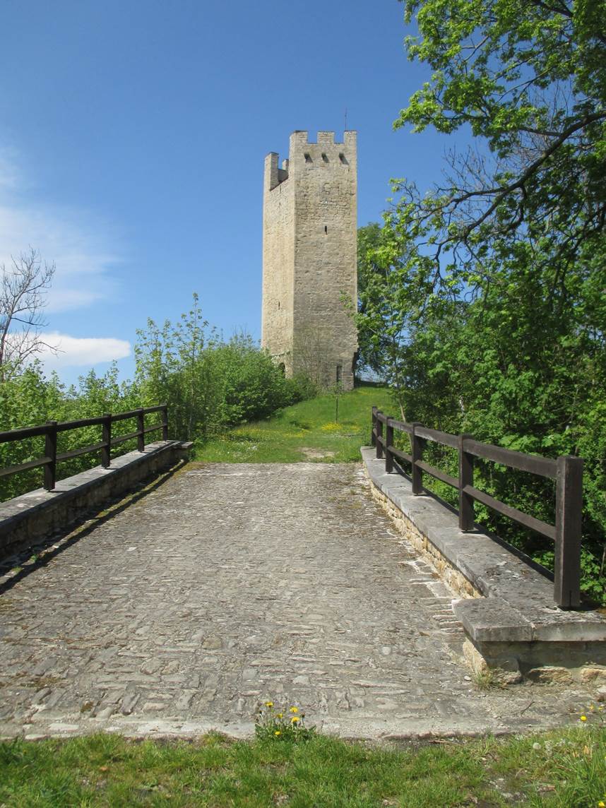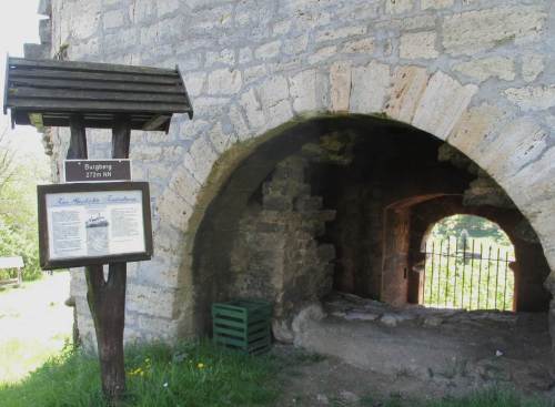 Zugang zur Burgruine, nur der Turm steht, restauriert.