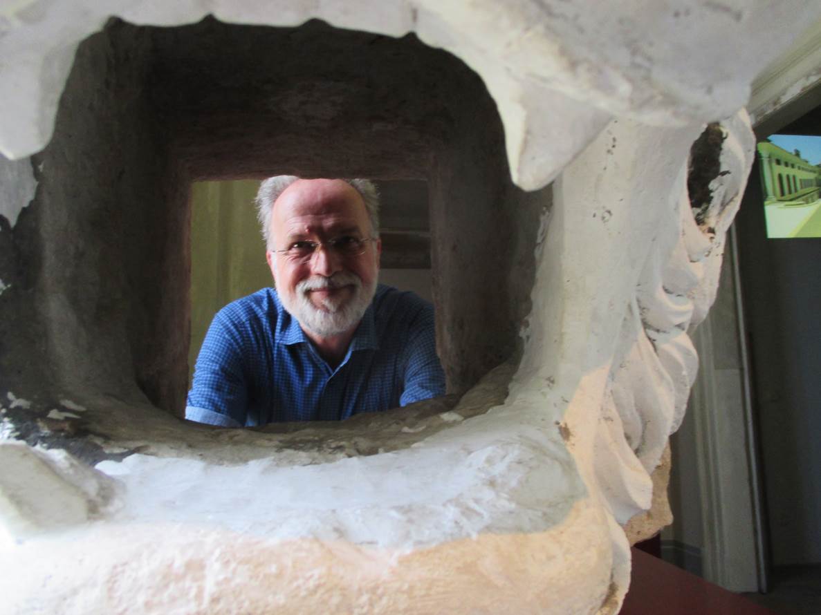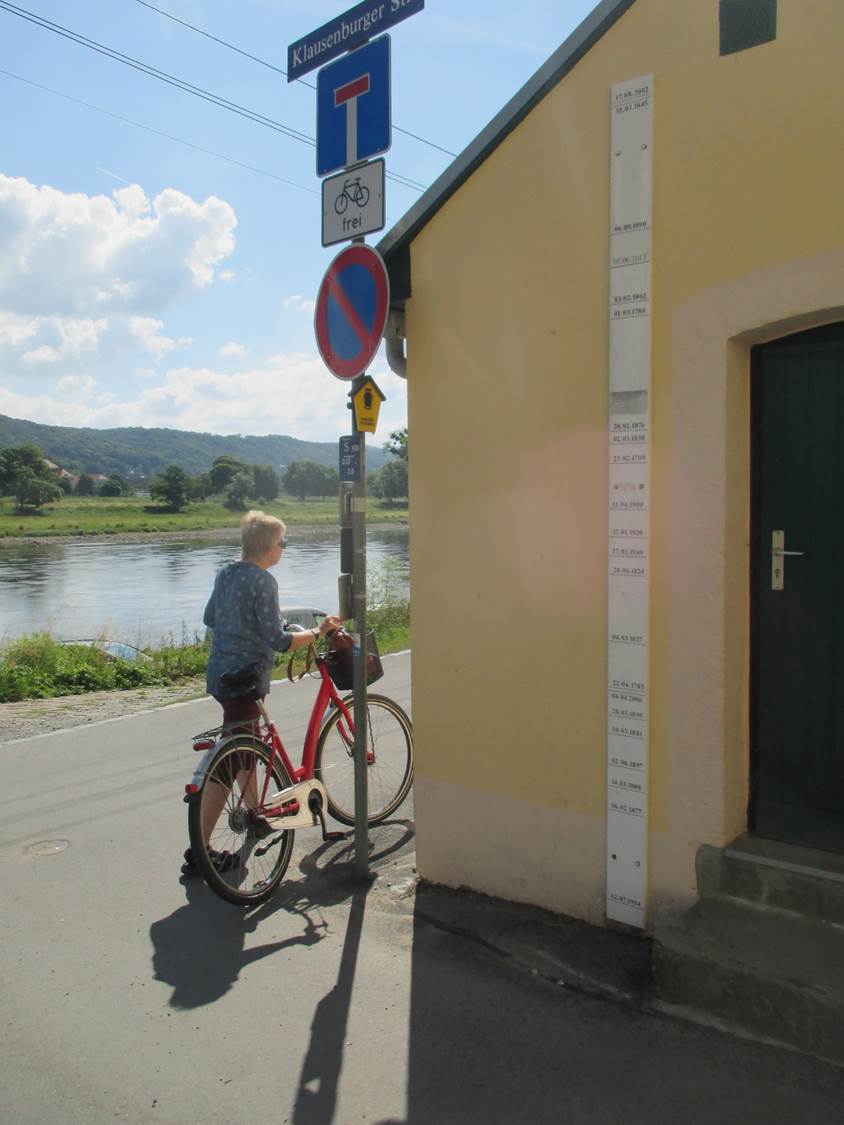 Der derzeitige Wasserstand ist allerdings nur eine Momentaufnahme. Das Gegenteil, Hochwässer mit über 2000 m³ Abfluss pro Sekunde, belegt der am gelben Haus dokumentierte Wasserstand (Hinweis zur Passantin: klein ist die nicht).