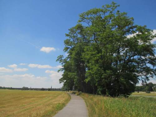 Wo früher Auwald stand, führt nun der Radweg durch teils baumlose Wiesen, heute heftig sonnenbeschienen.