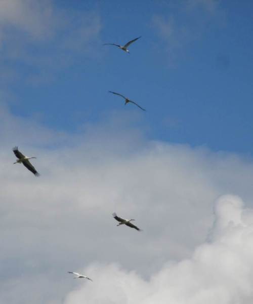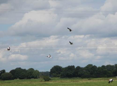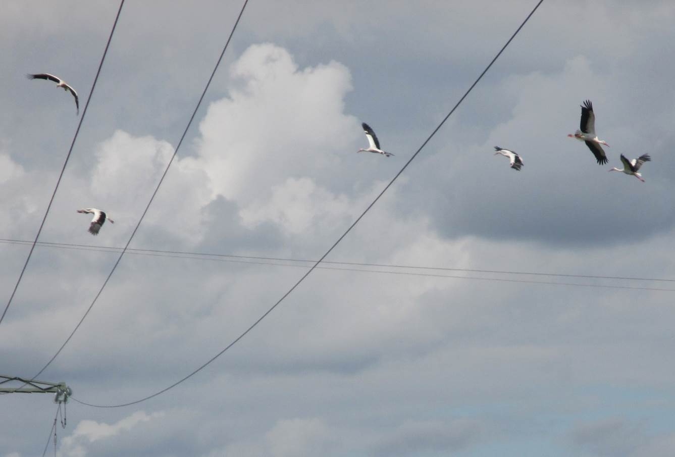 6 Störche im Bild, schrauben sich in den Himmel, die Hochspannungsleitung wahrnehmend und vermeidend.