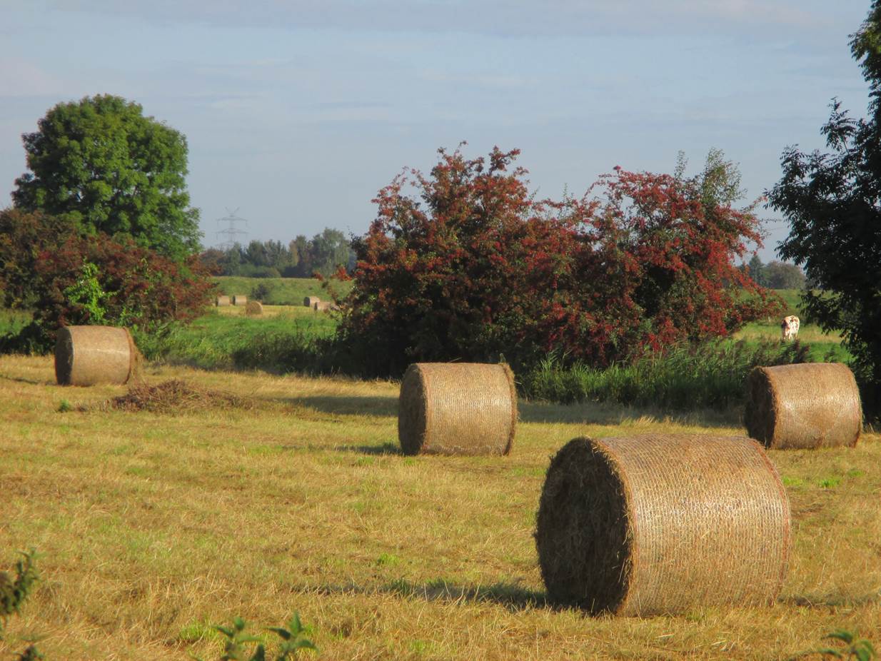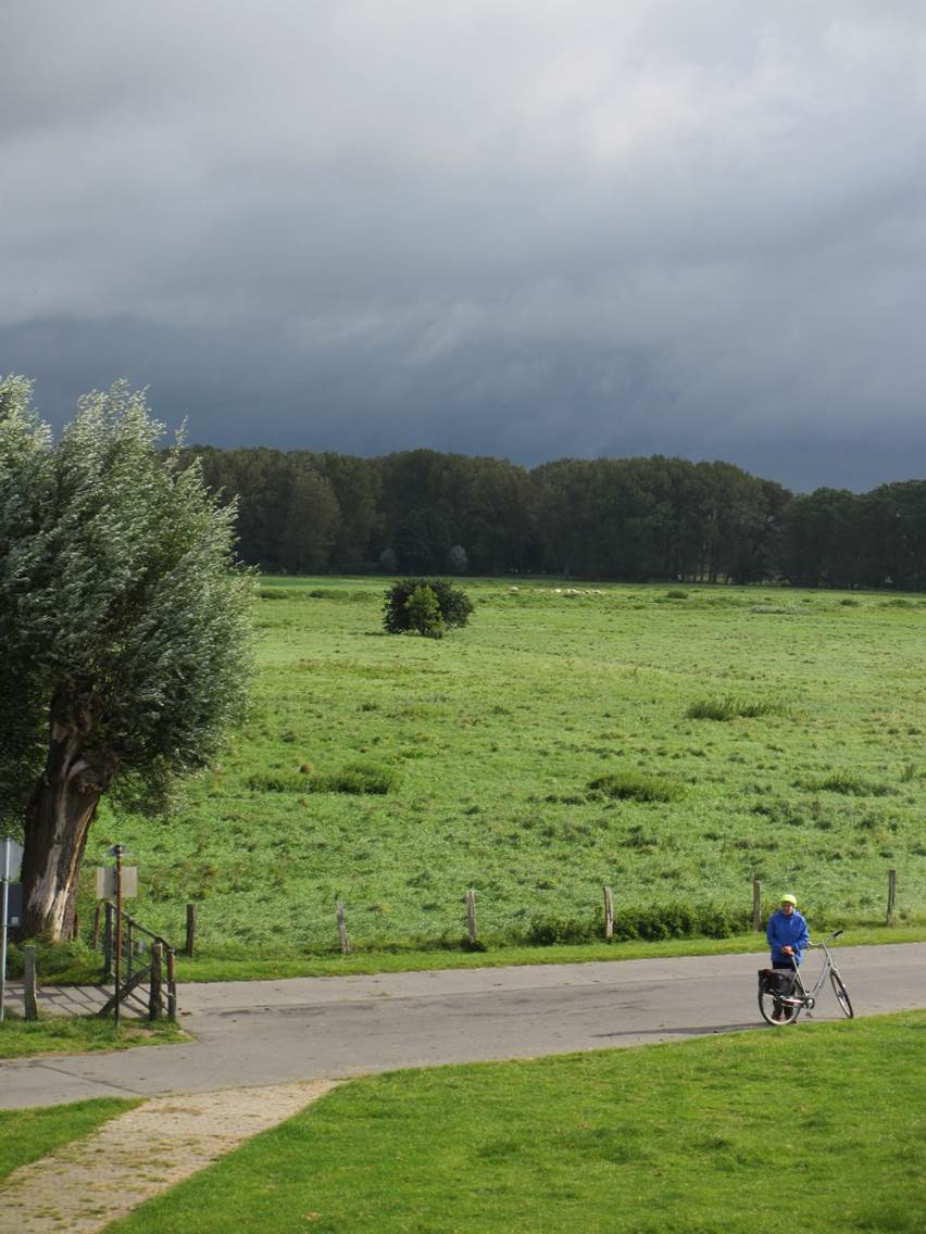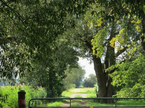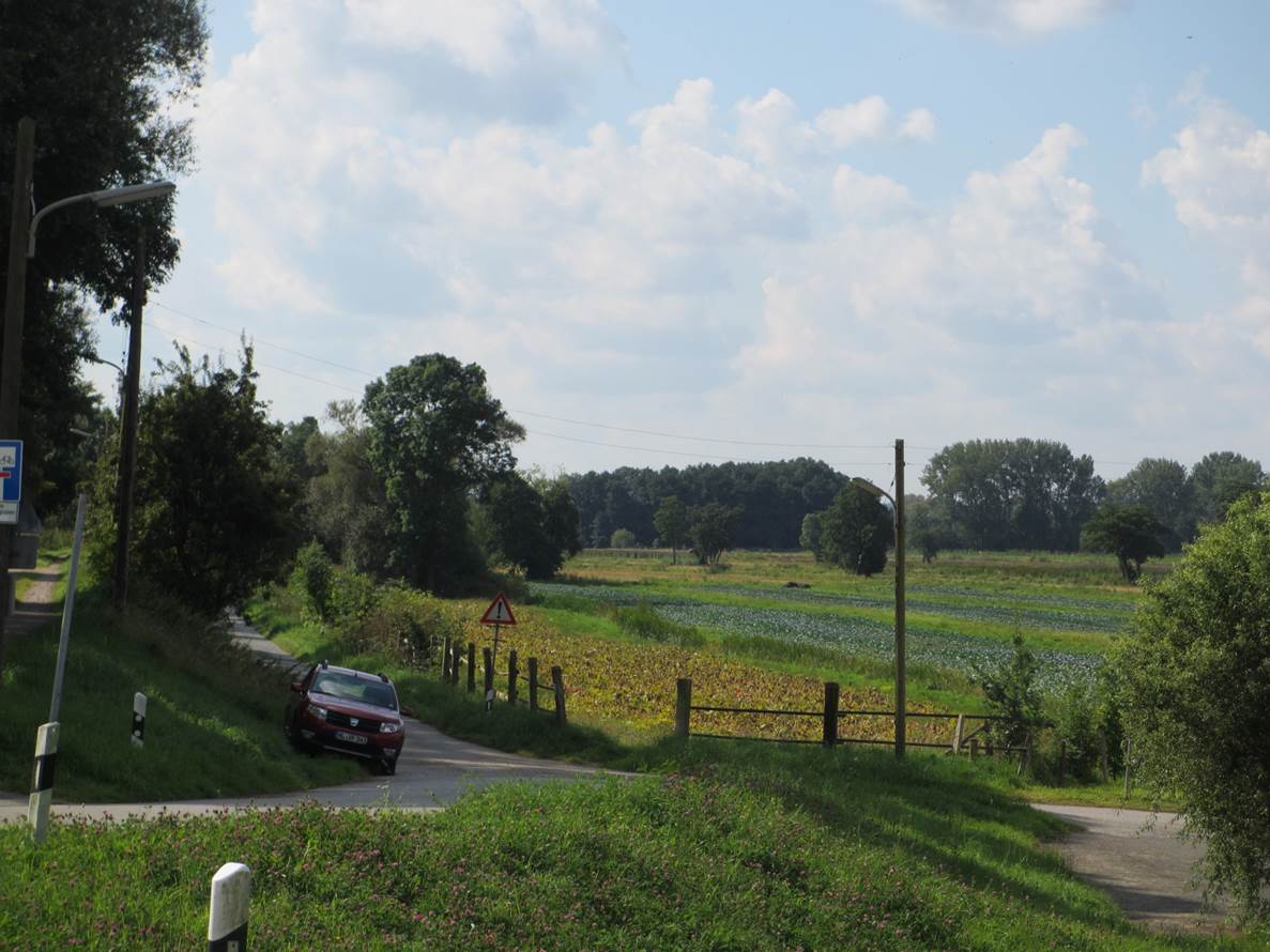 Schön im Schatten am (in heutiger Sicht erstaunlich niedrigen) alten Einlagedeich wartet mein Auto. Daneben sind die traditionellen Anbauflächen zu erkennen.