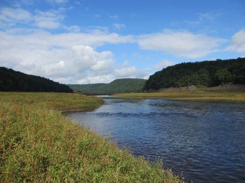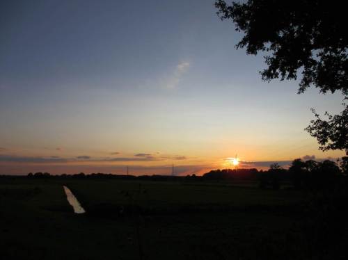 Alte Bäume, in der Marsch allzu selten, stehen auf der anderen Seite.