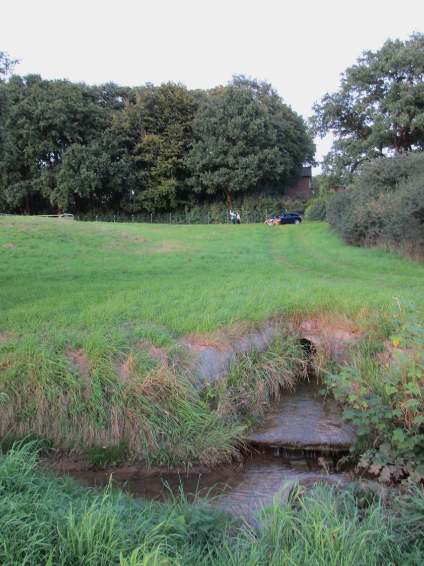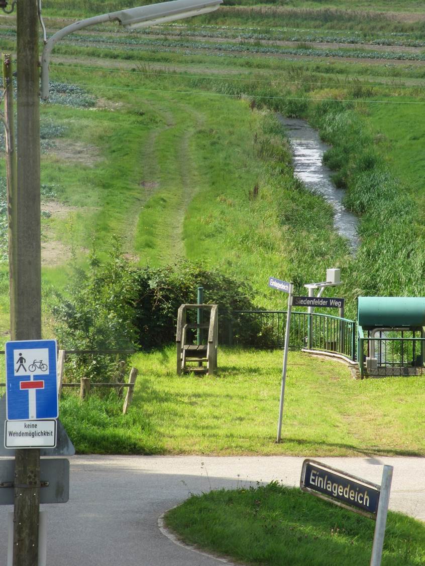 Und hier im Original – sommerlich verkrauteter Marschgraben am Einlagedeich („Wettern“, wie die örtliche Bezeichnung auf dem Transparent eben zeigt).