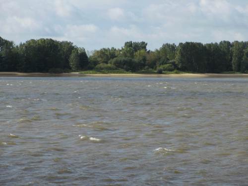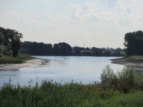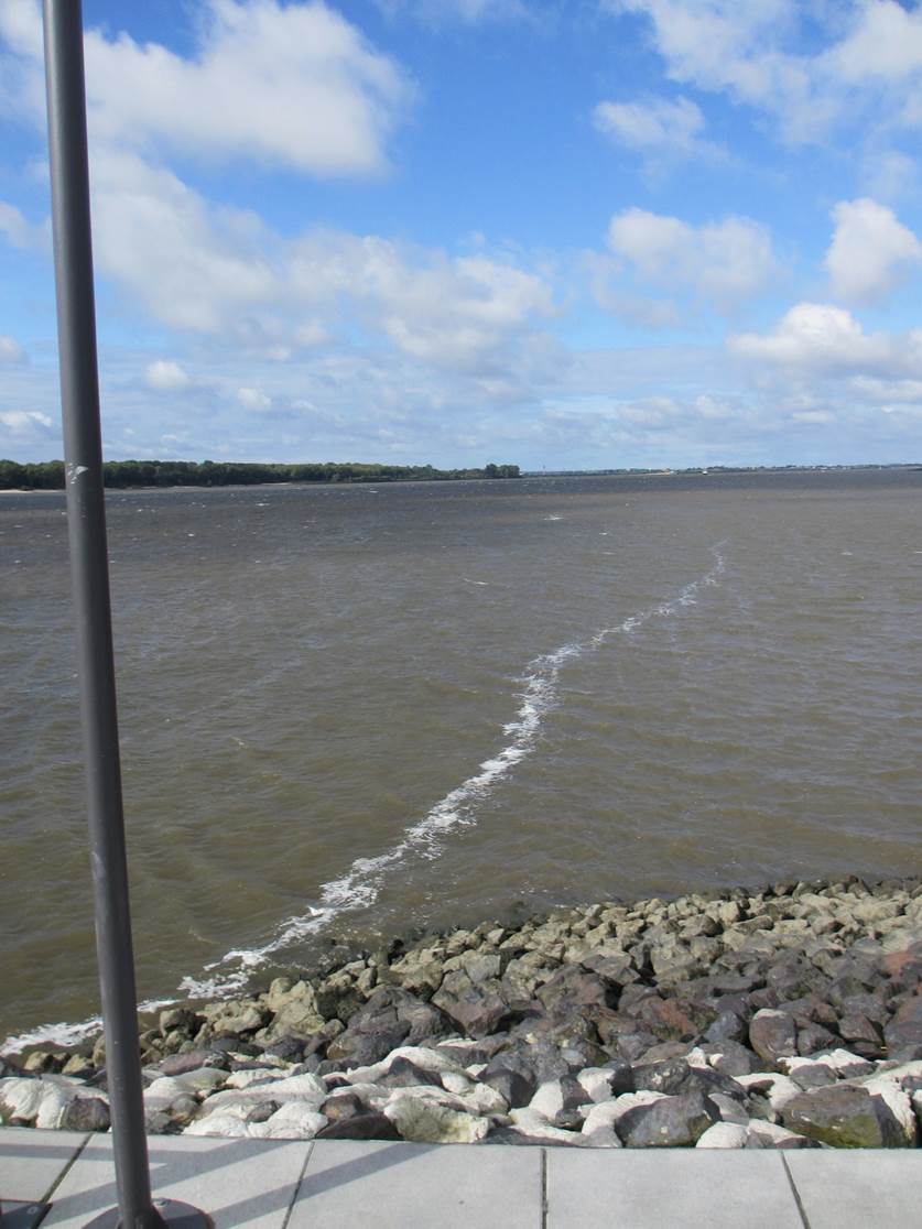 Nochmals über den Deich geguckt: die Flut hat eingesetzt. – Oha! Man sieht das menschenverursacht verschärfte Strömungsgeschehen. Das Wasser schiesst nur so in den neuen Flutraum hinein.