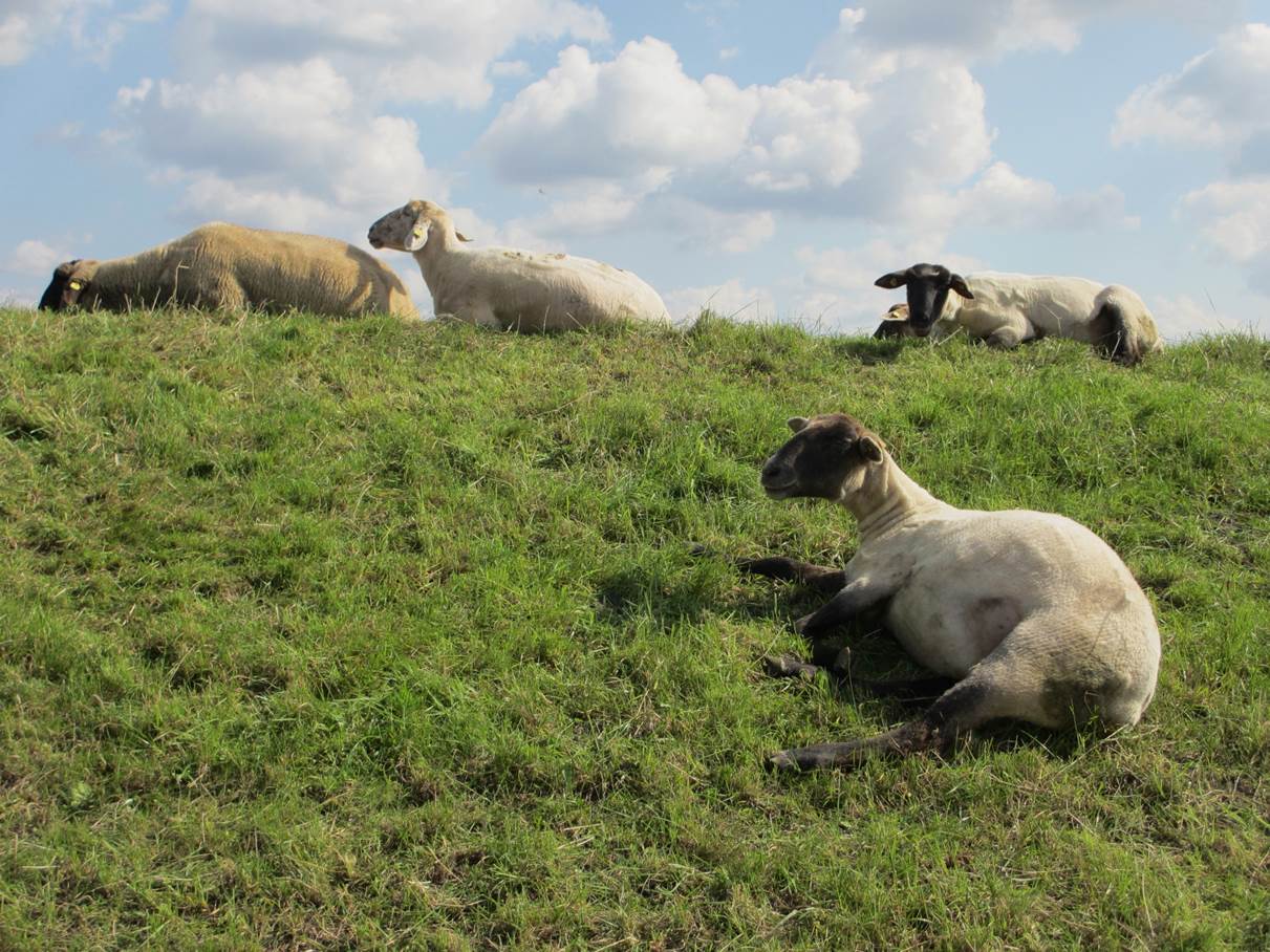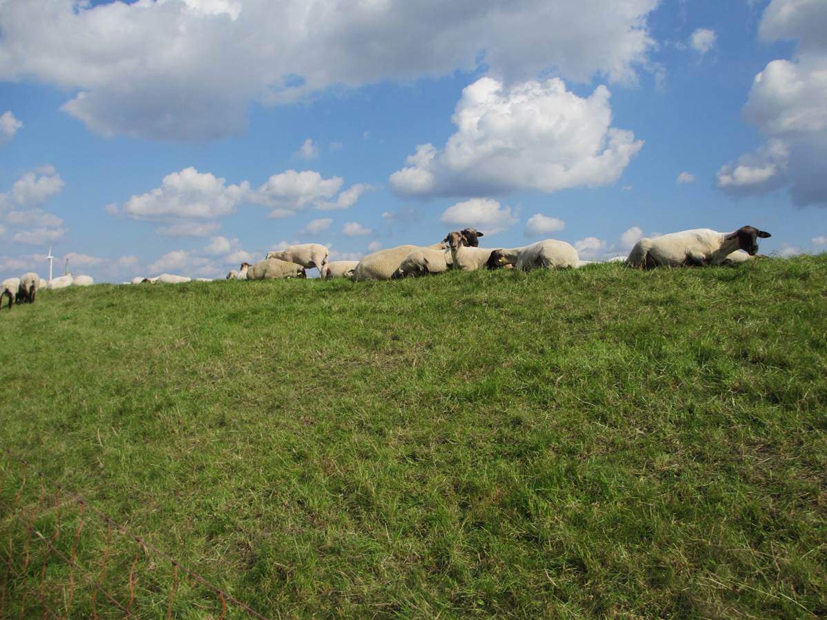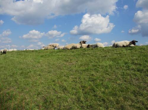 Fast alle haben die Deichkrone angesichts des intensiven Sonnenscheins als Platz ausgesucht. Bevor sie am besonnten Hang gebacken werden, geniessen sie lieber das heute eher schwache Lüftchen, das ganz oben über sie zieht.