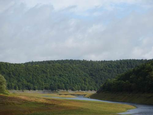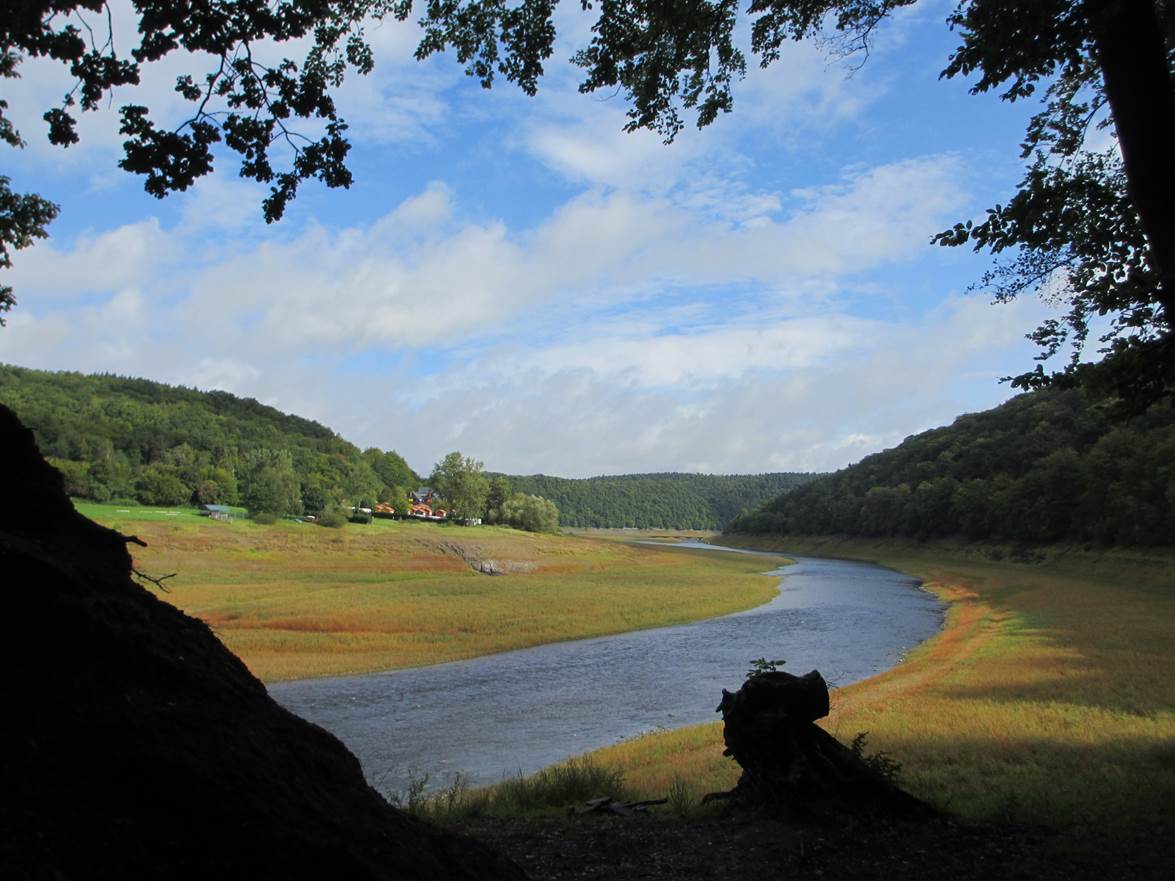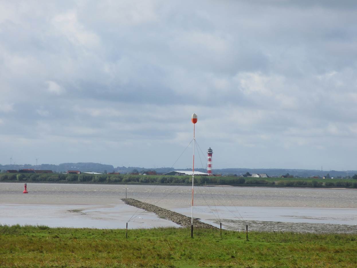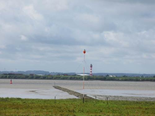 Der Blick über den Deich zeigt, dass ich gerade Tideniedrigwasser erwischt habe, Tiefpunkt der Ebbe.