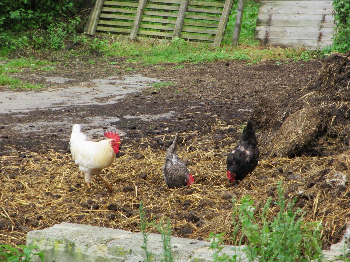 Aufmerksamer Hahn mit Hühnern auf dem Mist – gleich kommt ein Konkurrent.